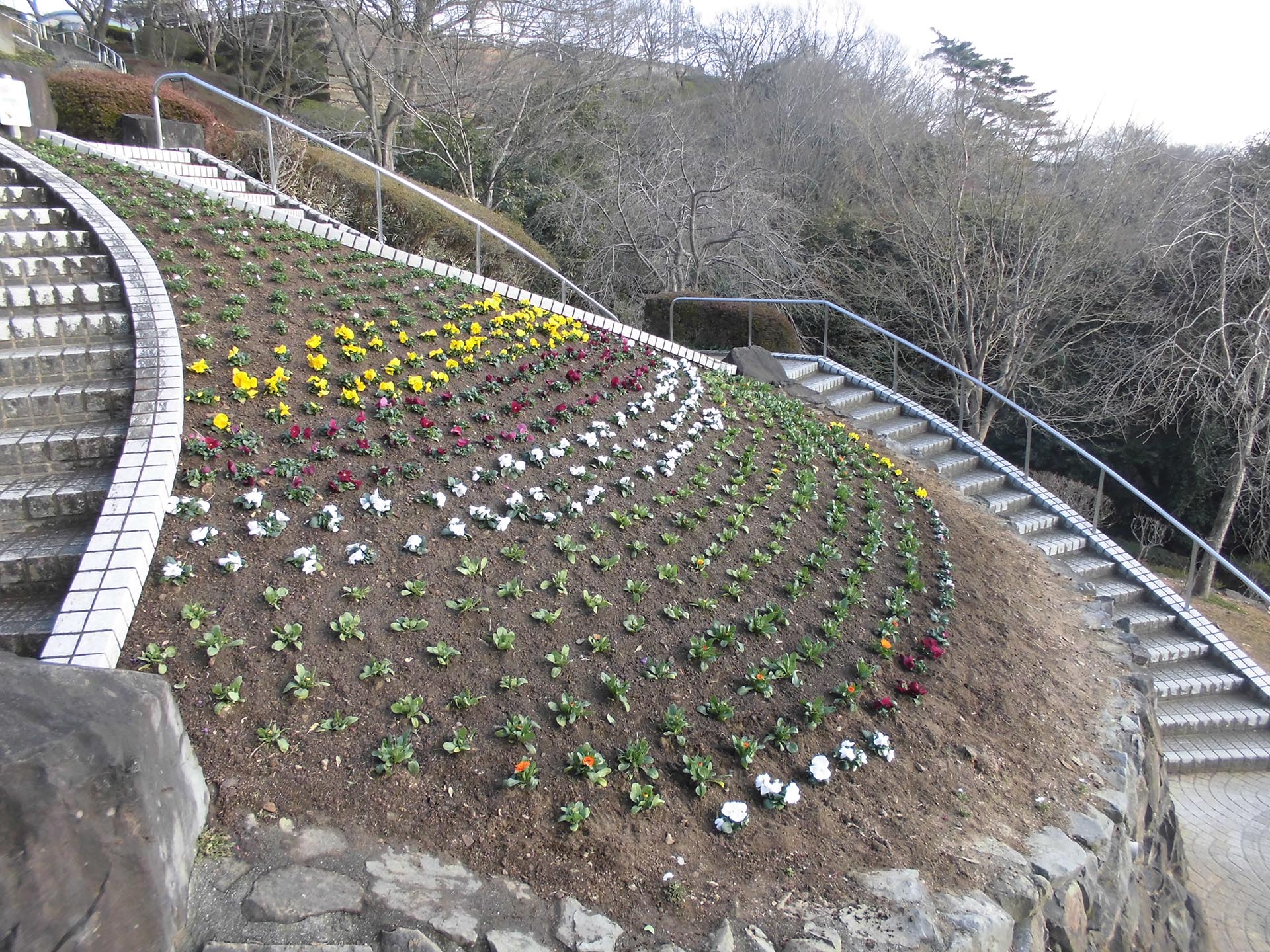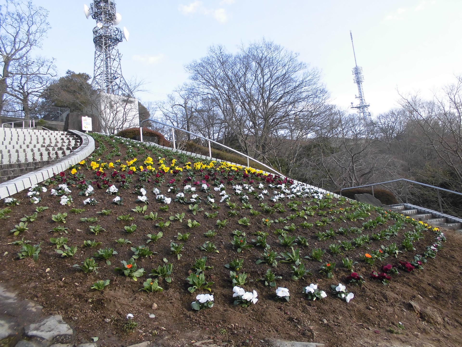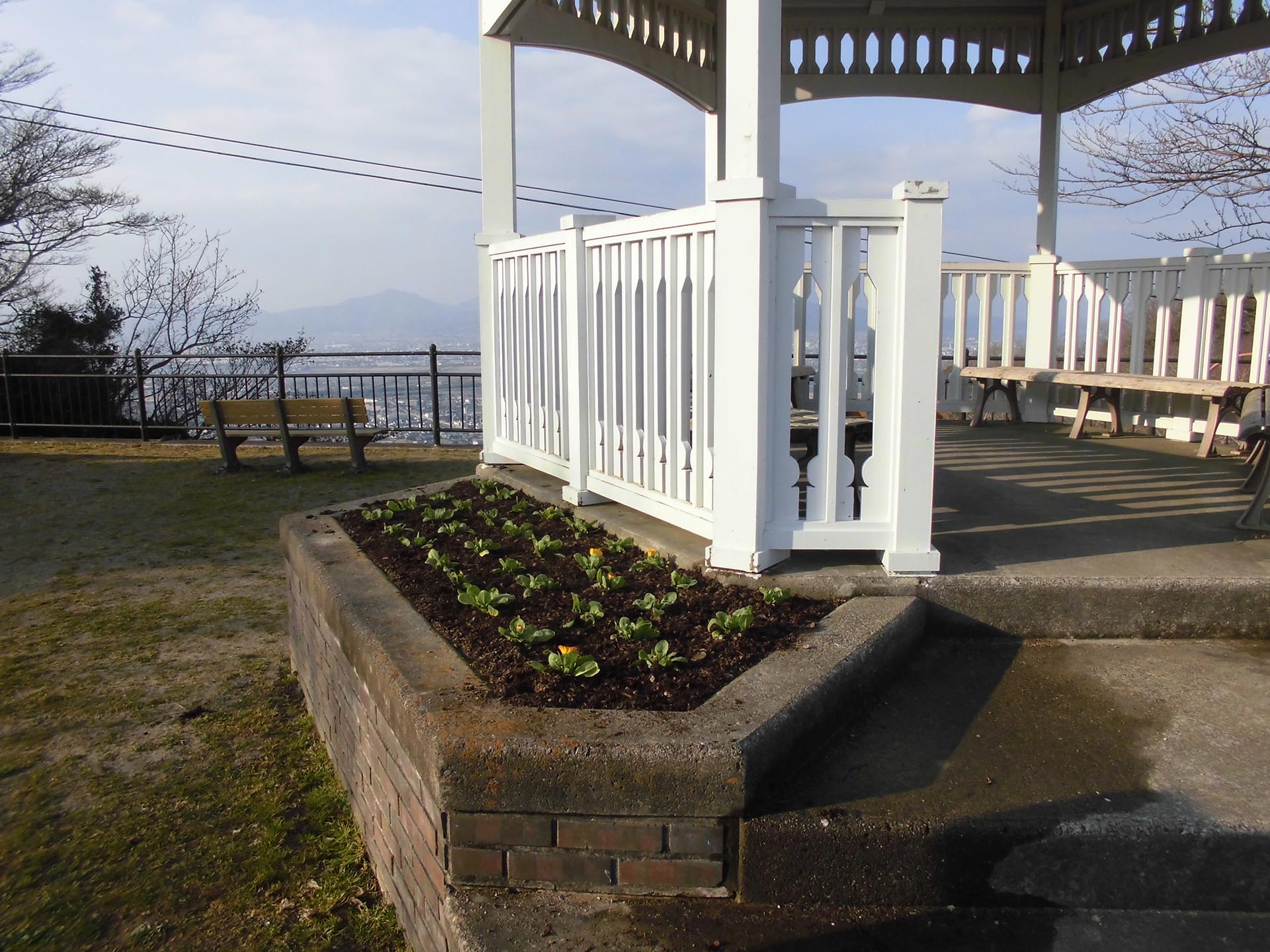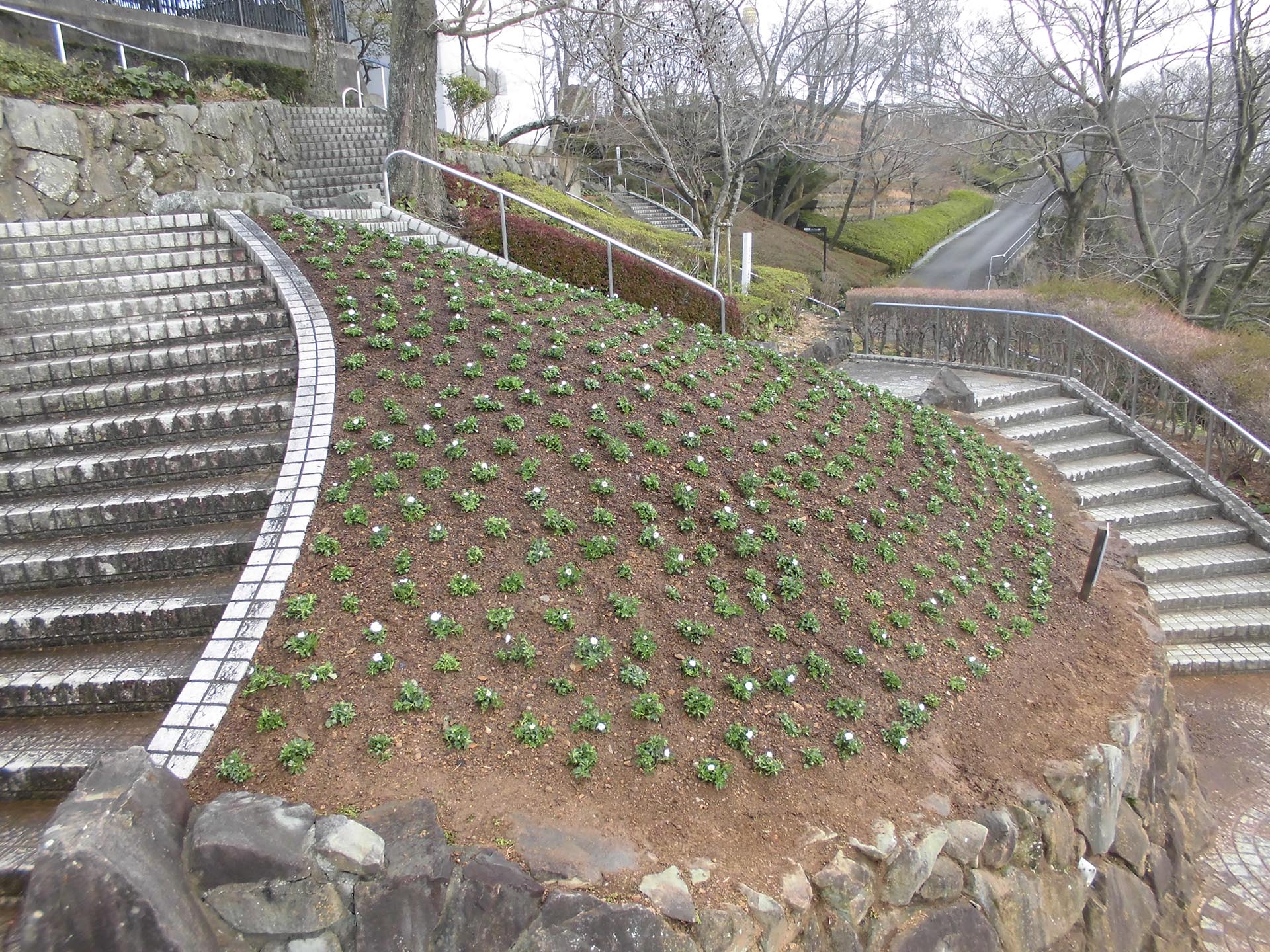 暑さ寒さも彼岸までの言葉どうり、春の訪れを実感するようになりました。この度、徳島県下有数の花見スポットである眉山公園において、サクラの開花に合わせてカスケードとガゼボの花壇に花を植えました。カスケードには、キンセンカ、ノースポール、パンジーの3種類で1880ポット、ガゼボにはキンセンカ80ポット植えております。