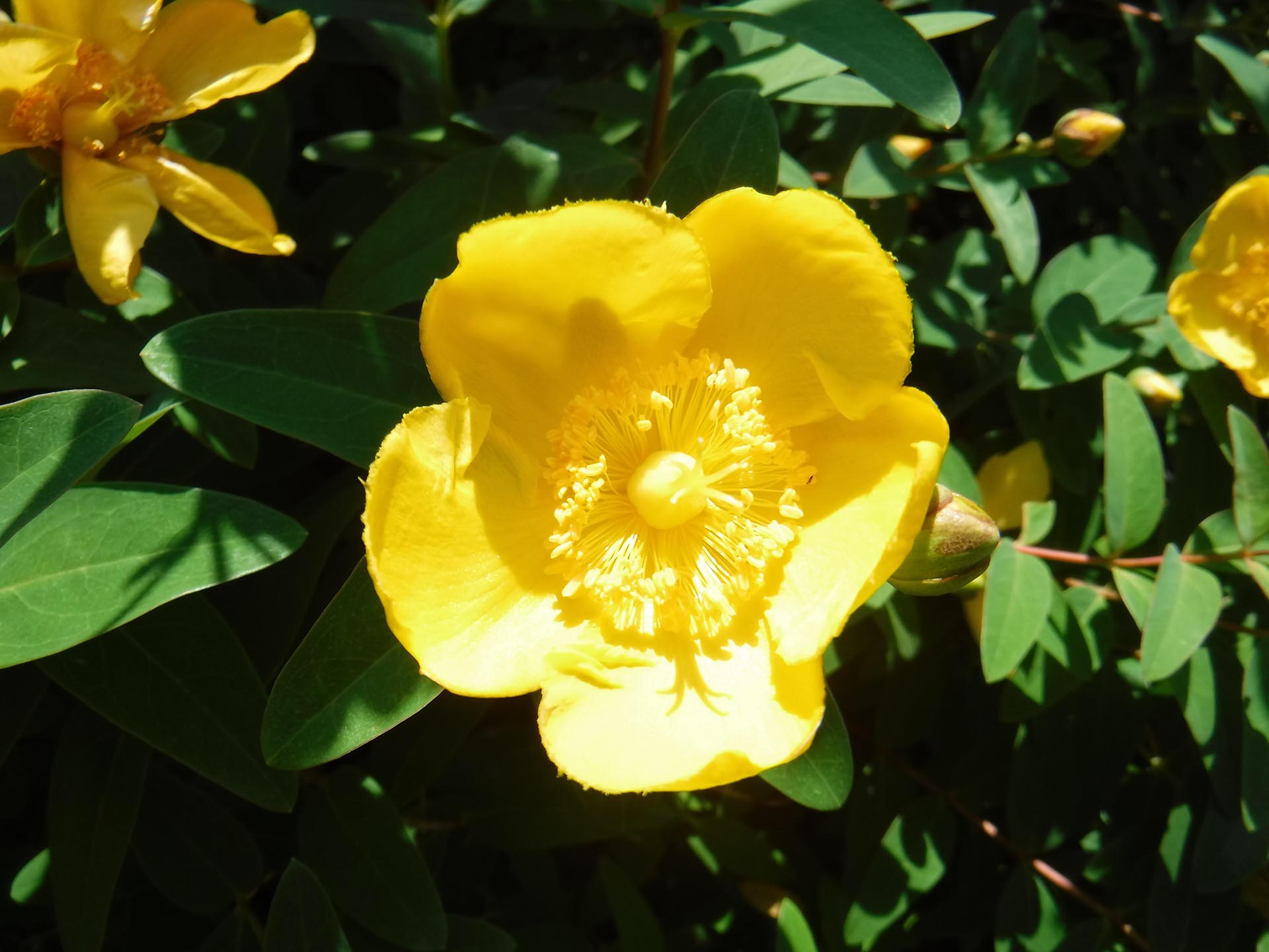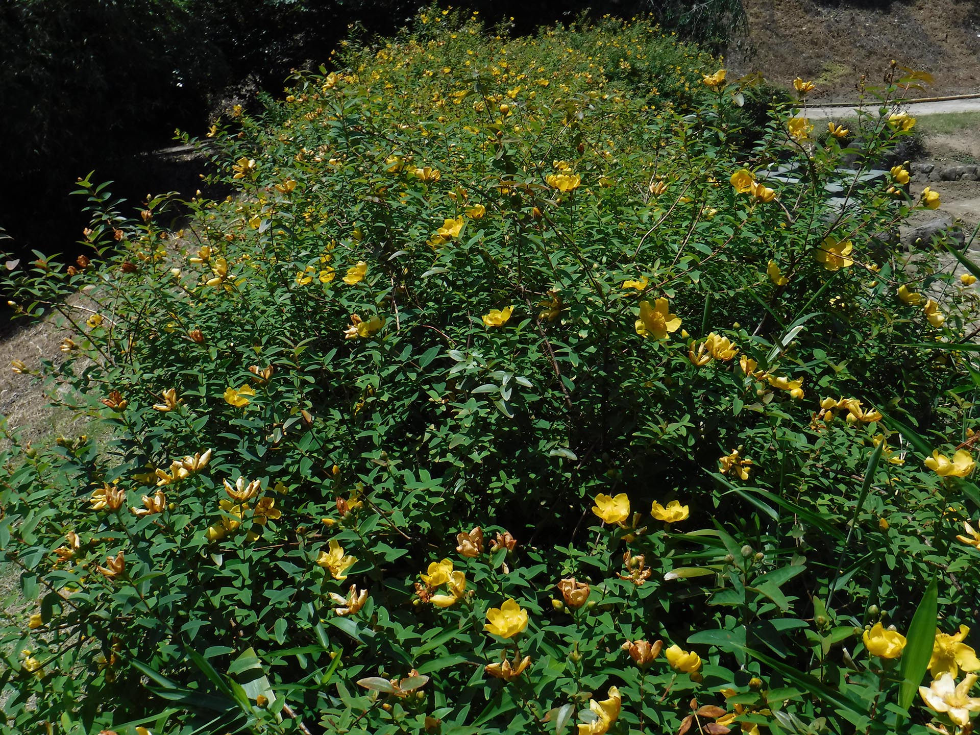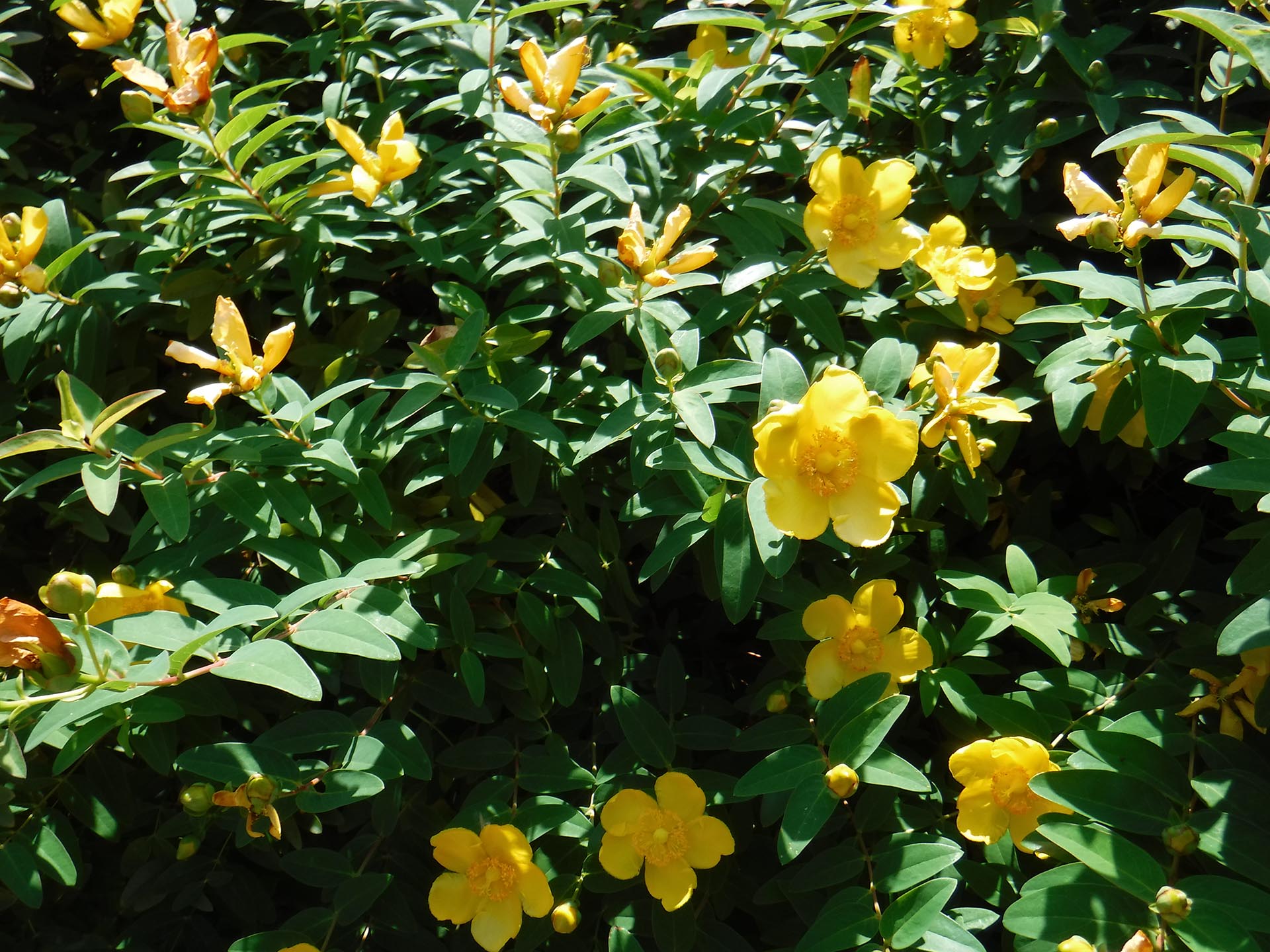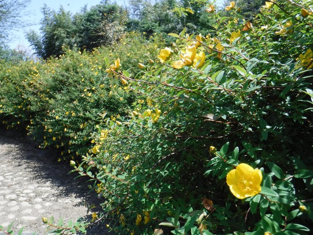 清流に若鮎のおどる季節となりました。枝に艶のある五弁の丸花を多数つけた、タイリンキンシバイの花が咲いています。タイリンキンシバイの花は、8cm程で鮮やかな黄色の花をやや上向きにつけて咲かせています。