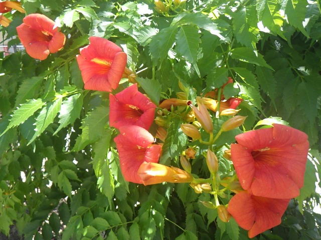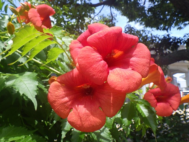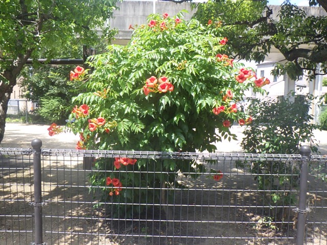 蒸し暑い日が続いていますが、北佐古緑地ではノウゼンカズラの花が見頃を迎えています。