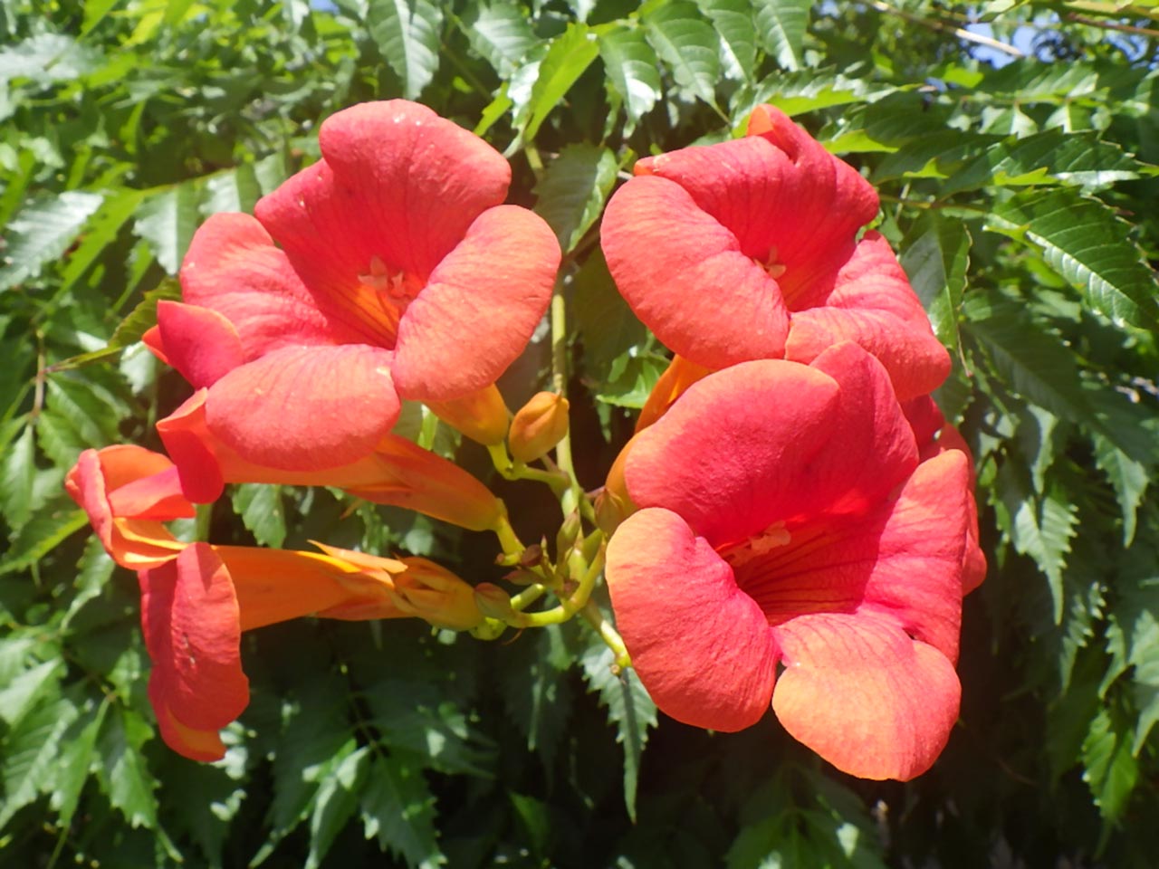 今年も梅雨の季節となりました。夏から秋にかけて、美しい橙色のノウゼンカズラの花が咲いています。ノウゼンカズラは垂れ下がった枝にラッパ型の花をたくさん咲かせます。ひとつひとつの花の寿命は短いですが、絶え間なく新しい花を咲かせるので夏の暑い期間、長く楽しめます。
