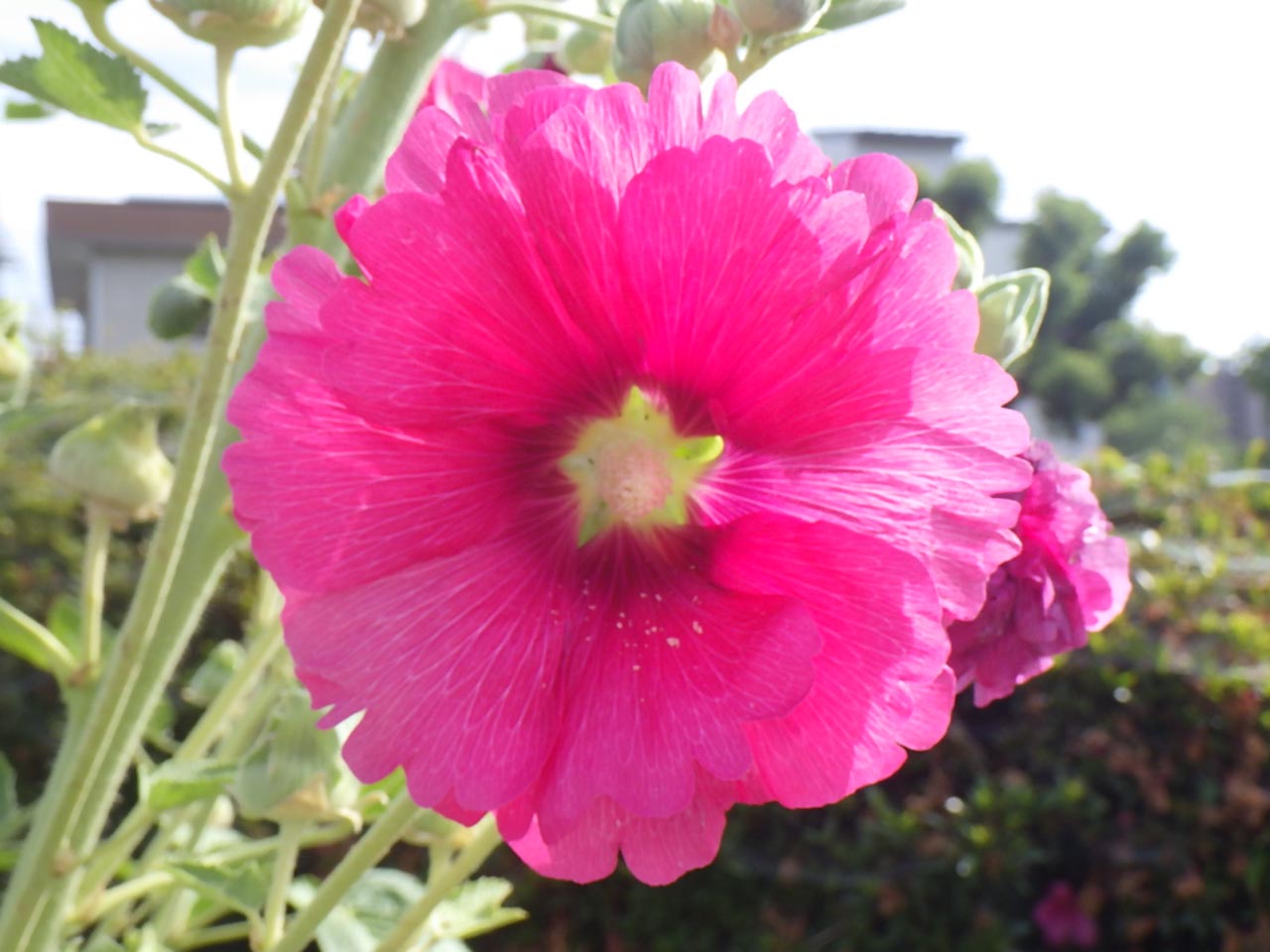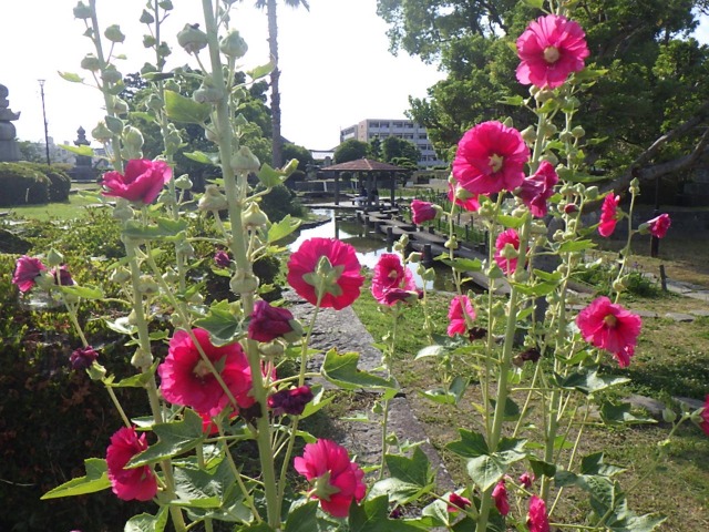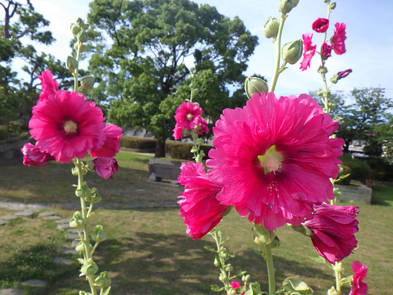 梅雨も中休みらしく、朝から気持ちのよい青空の下で、助任緑地のタチアオイの花が見頃を迎えています。