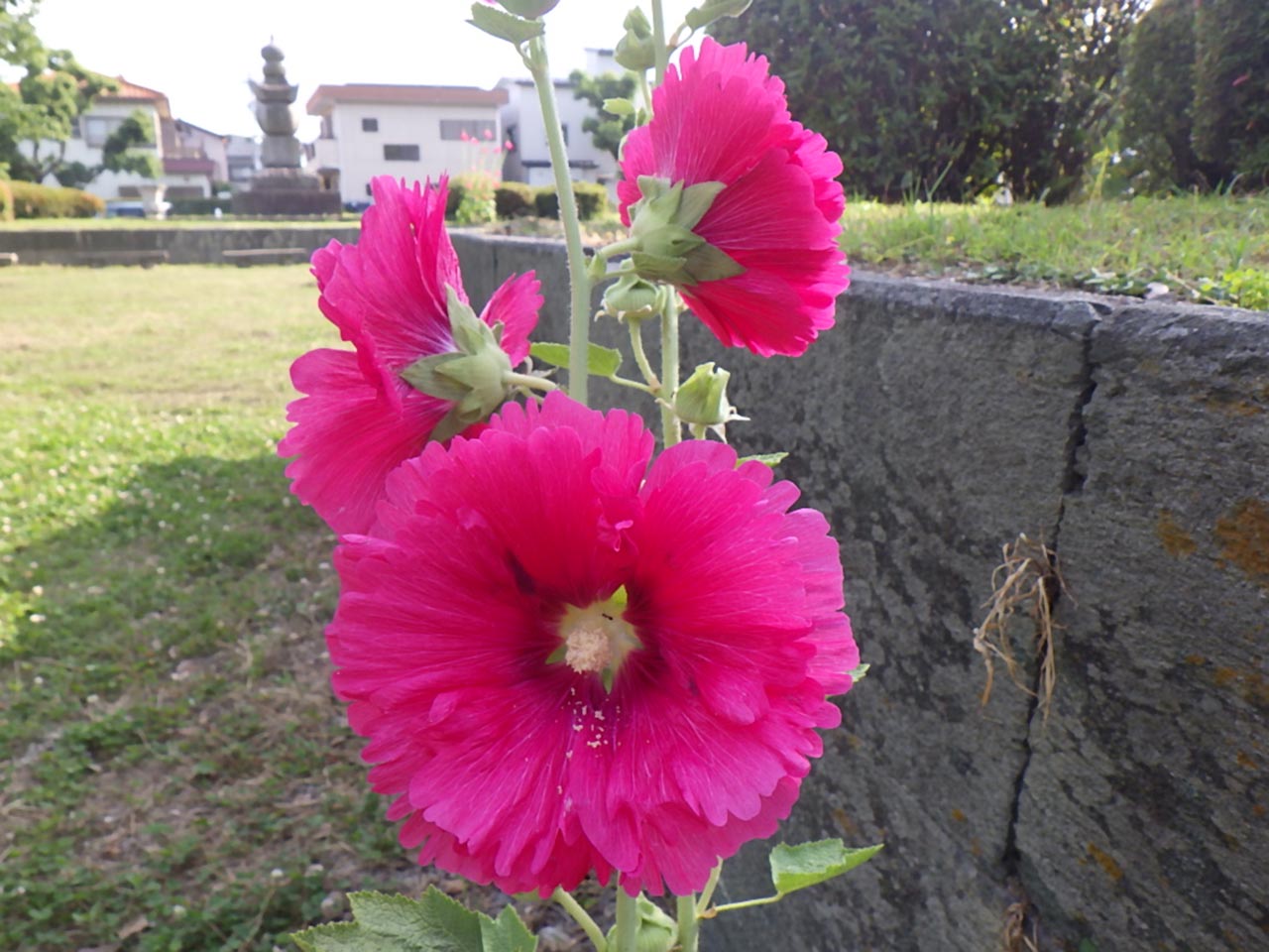 梅雨とはいえ、連日好天が続いております。梅雨入りの頃から夏にかけて、ハイビスカスのようなタチアオイの花が咲いています。タチアオイは、太い茎が真っ直ぐに立って伸び、赤、ピンク、黄色、白、濃い紫等の花が下から上に順番に咲いていきます。