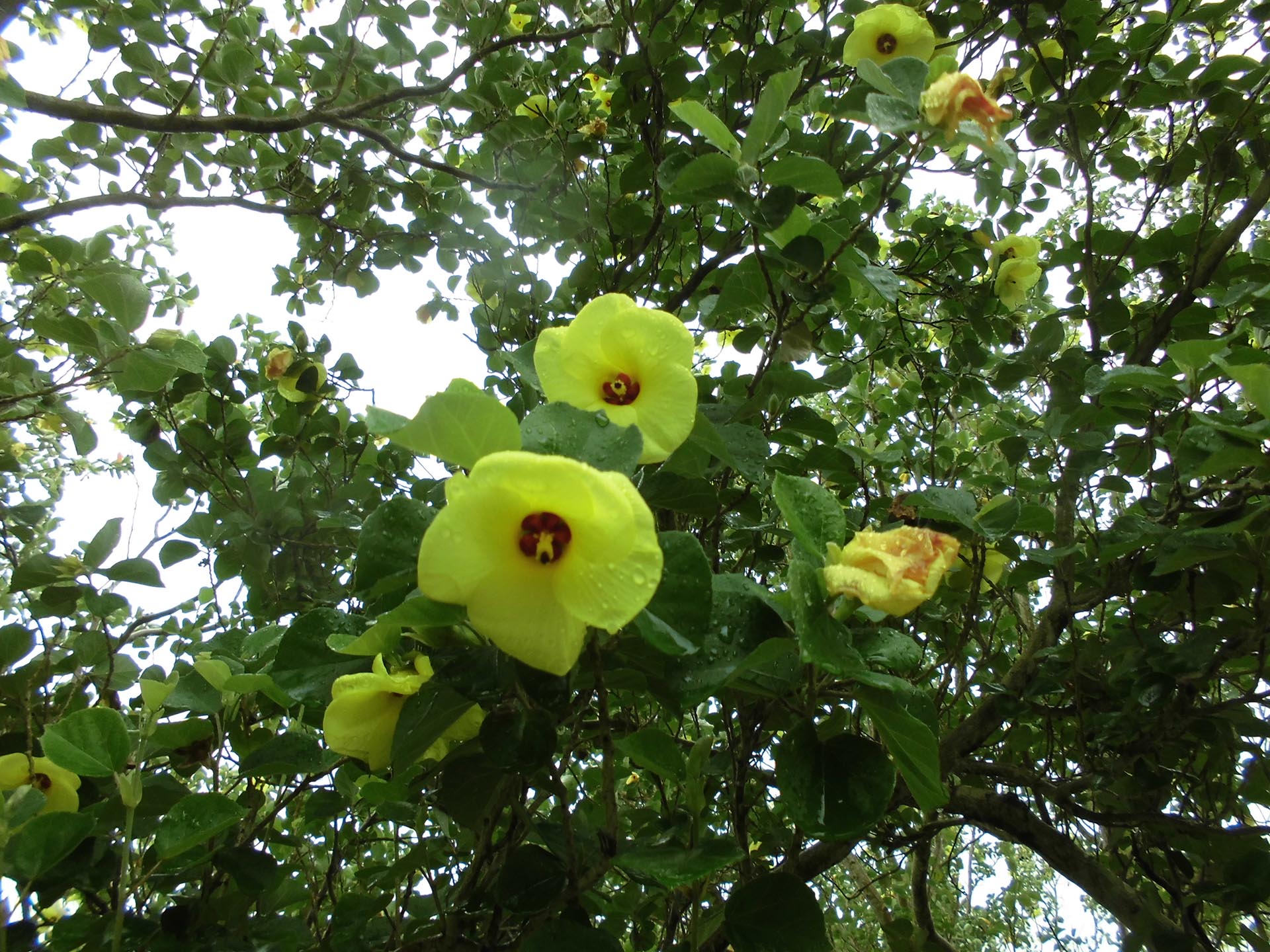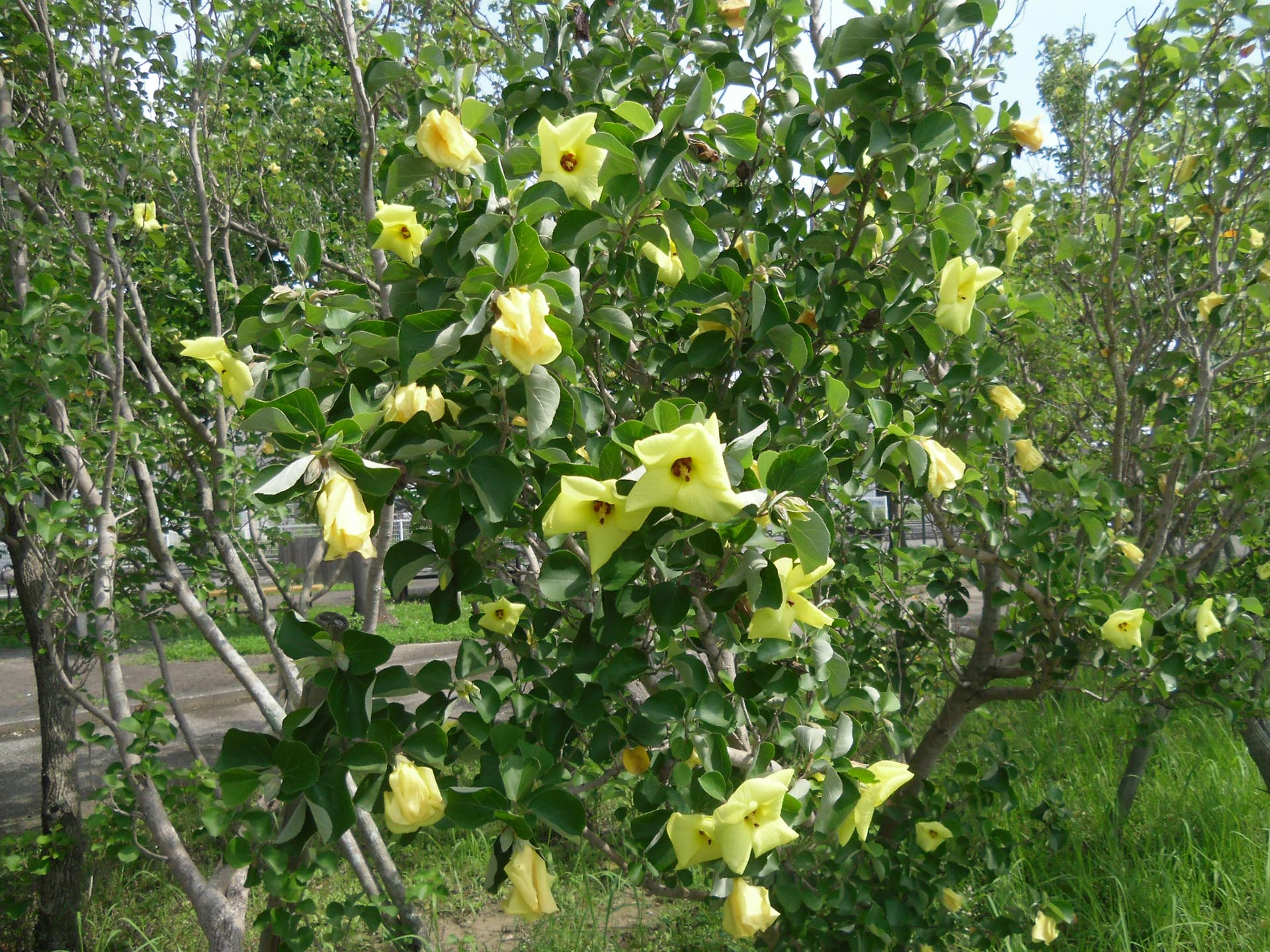 蝉の声にも暑さを感じる日を迎えている中、浜辺に生育しているハマボウが、とても爽やかな花を咲かせています。ハマボウの花は、夏の盛りに鮮やかなレモンイエローの花を咲かせます。また、花は一日花で一度咲くとしぼんでしまいますが、次々に咲き続けるので最盛期には毎日枝いっぱいの花を見ることができます。