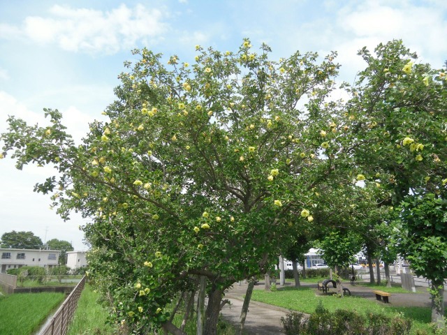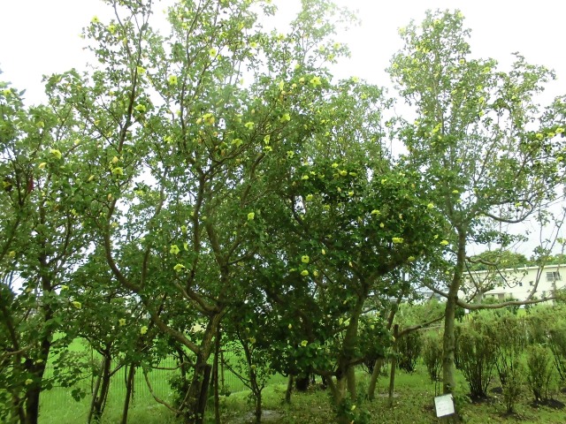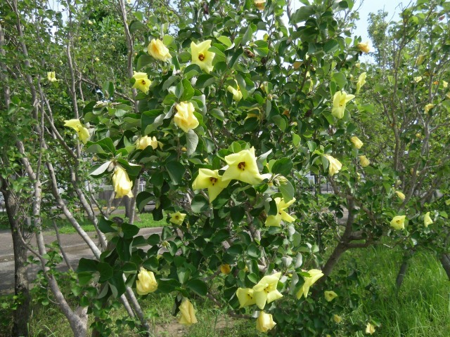 夏の太陽に負けず、応神町のハイテクランド徳島南公園では、50本のハマボウがレモンイエローの花を咲かせているのを楽しむことができます。