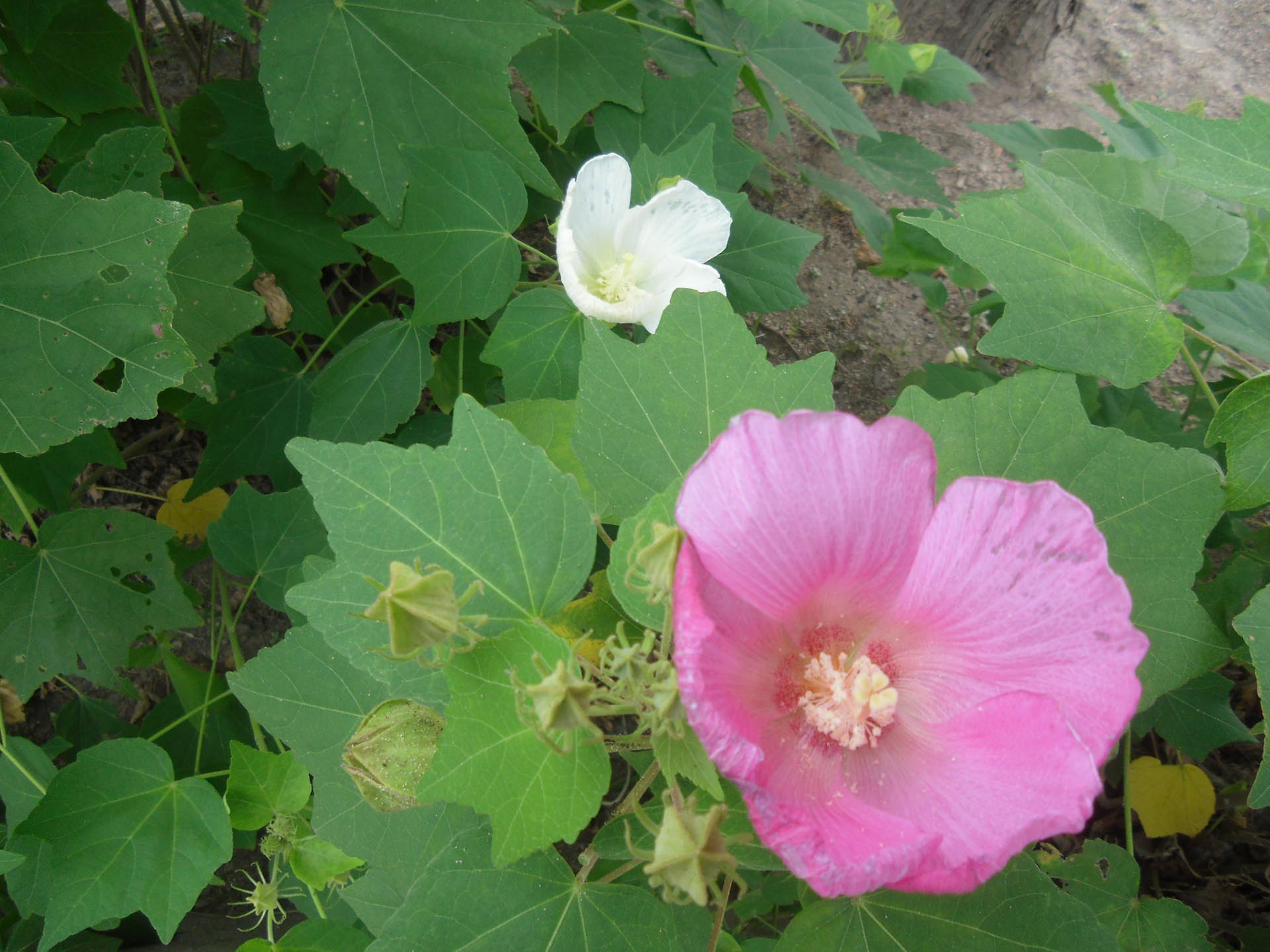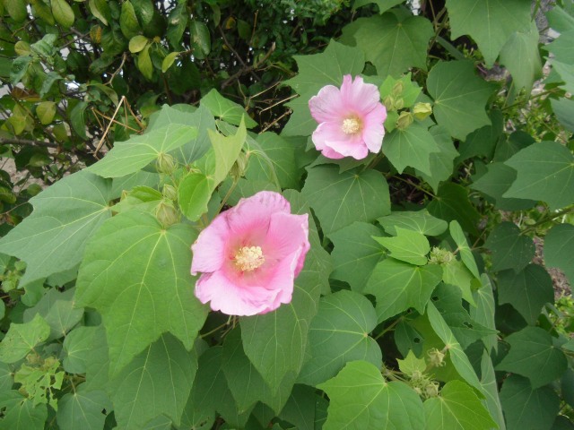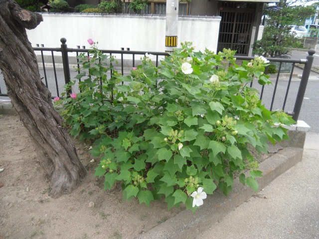 朝夕の風に涼しさが感じられるものの日中の暑さは、まだまだ人にも植物にもきびしい日々が続いております。この暑さにも負けず、しとやかで優しいフヨウの花が咲いています。フヨウは、ピンク、白等の花を付け、夏の長期間に渡り毎日次々と花を咲かせています。花は、朝咲いて夕方にはしぼむ一日花です。