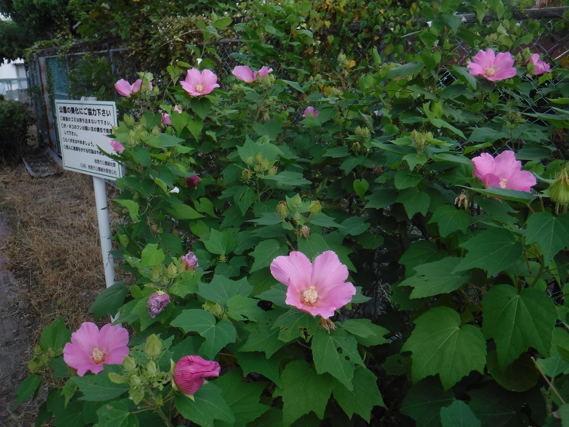 これからも残暑が続きそうですが、寺島東公園、不動3号公園等で、フヨウの花が見頃を迎えています。