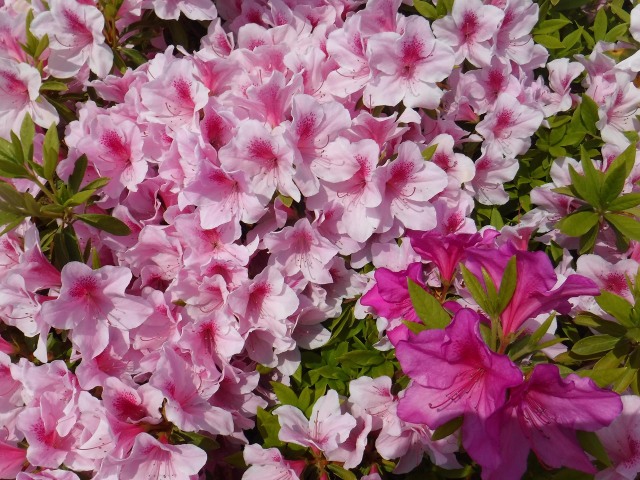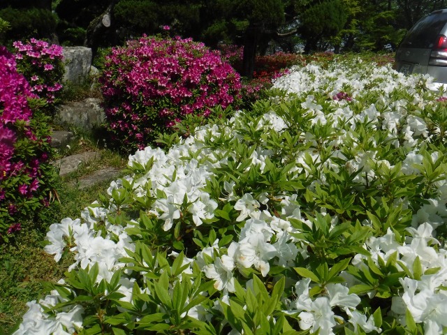 春も深まり、木々の緑が濃さを増してきたように感じられる今日この頃、常緑低木の枝先に大きなヒラドツツジの花が、次々に連なり咲いています。ヒラドツツジの花は、4月中旬から5月上旬に若葉が出るよりも先に開花します。花の色は白やピンク、赤、赤紫等があり、色の濃淡も様々あります。