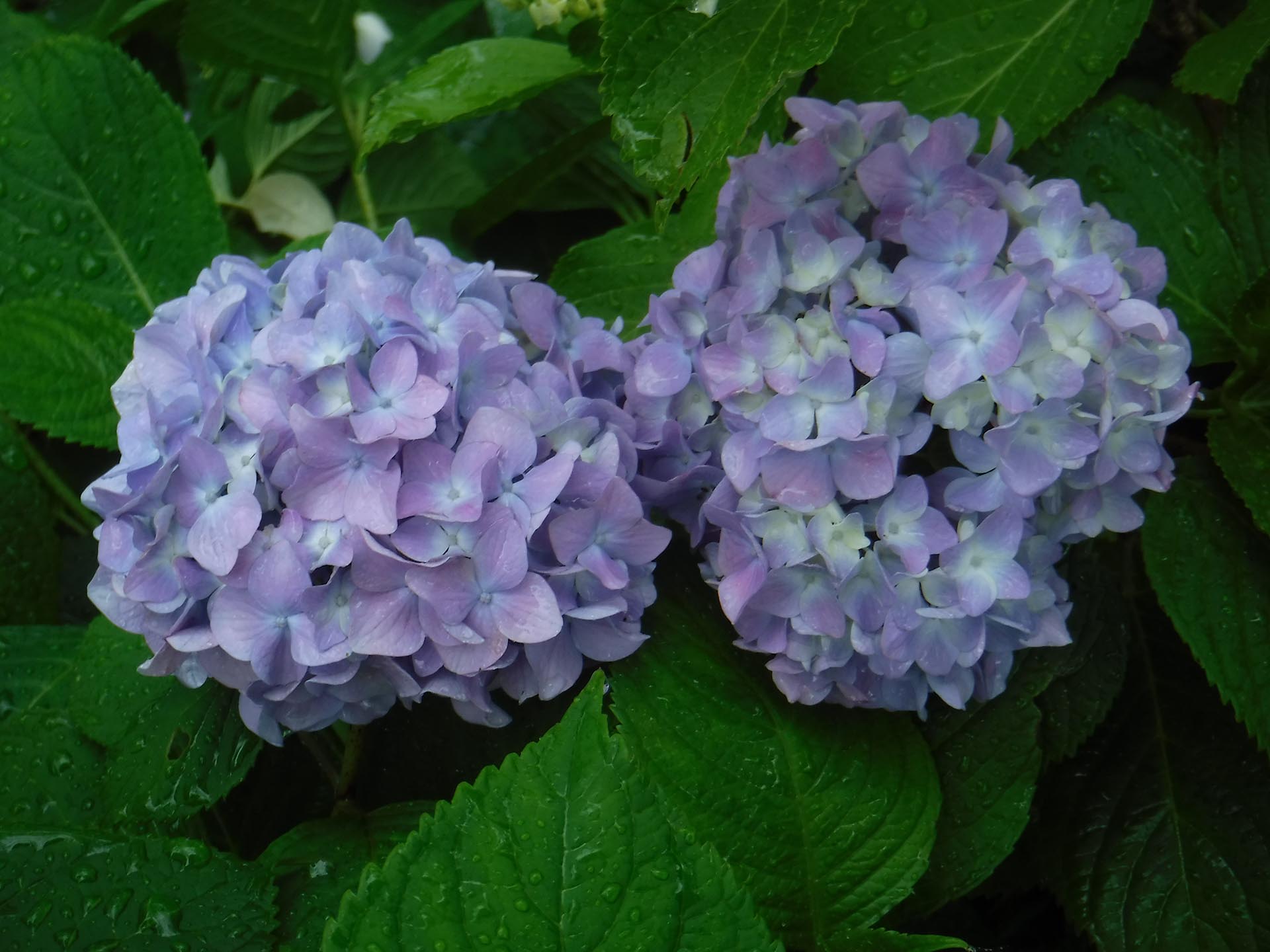 アジサイの紫色の花が日ごとに深まり、西部公園、地蔵院池緑地でアジサイの花が雨に濡れて美しく輝いています。