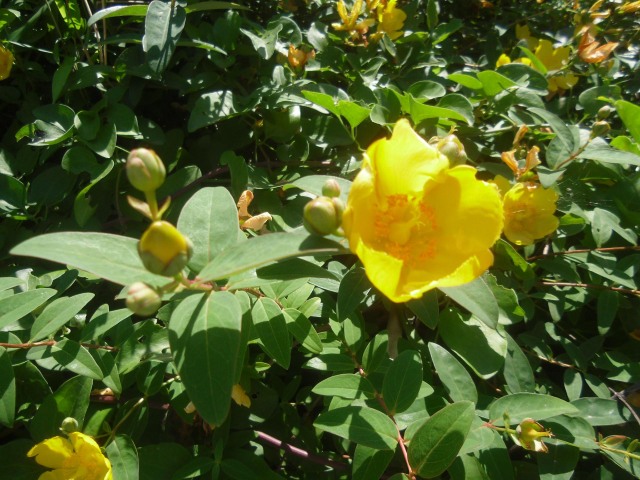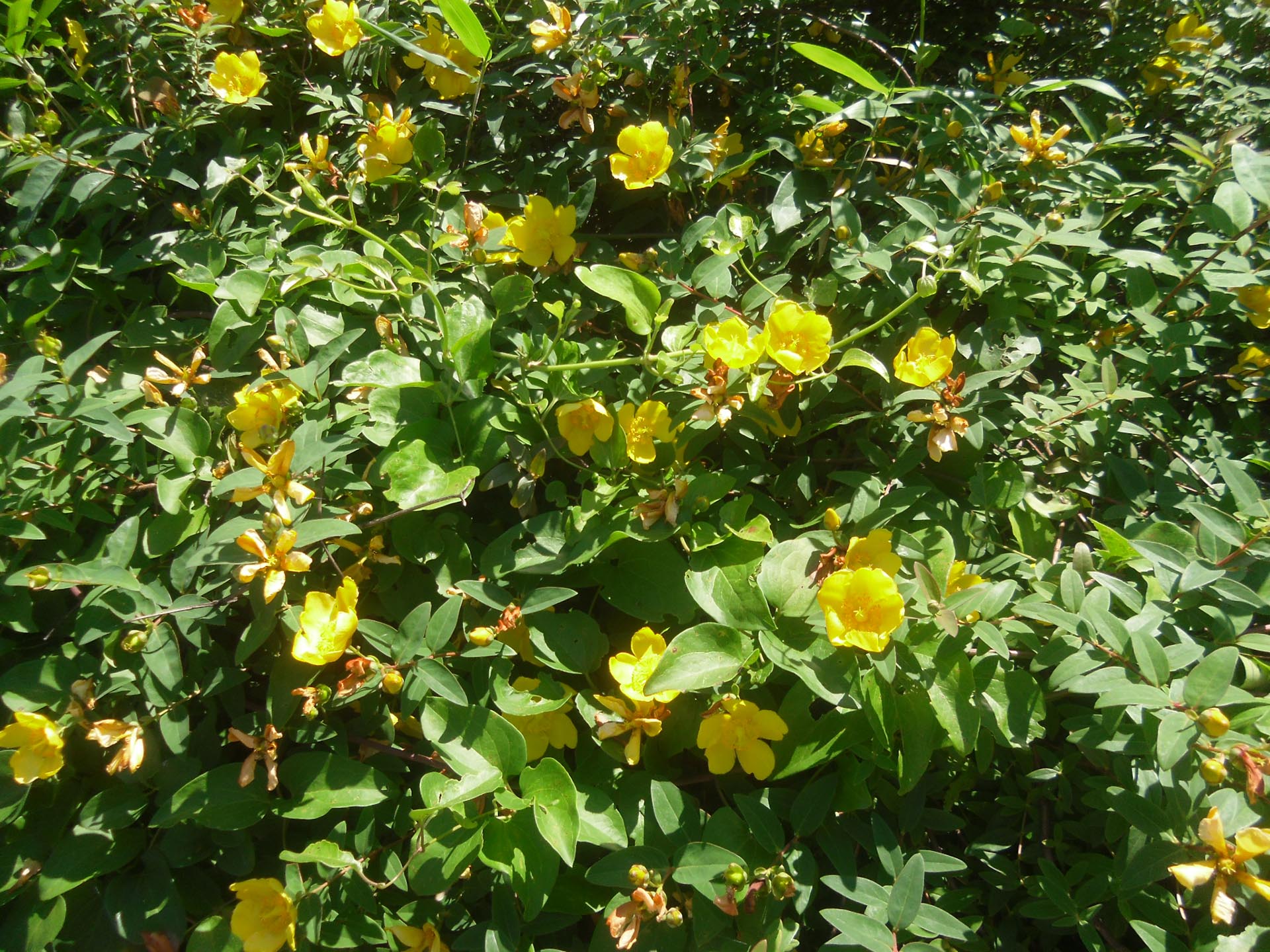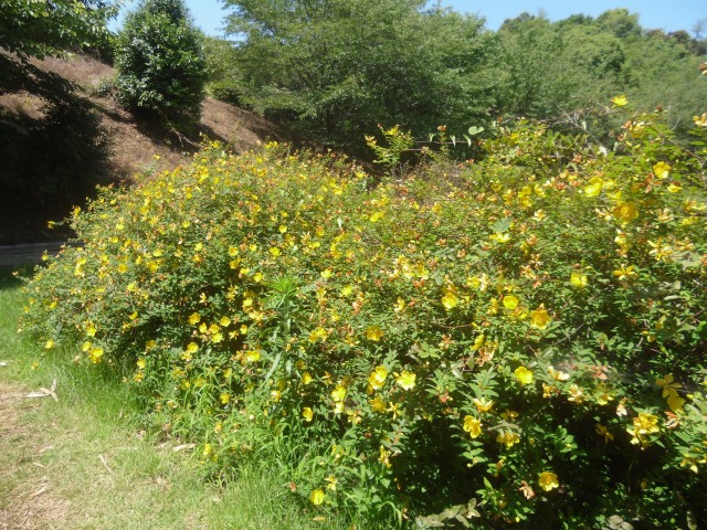 雨に濡れたアジサイの花がひときわ美しい季節となり、続いてタイリンキンシバイが次々と鮮やかな黄色い花を付け始めています。タイリンキンシバイは、春から夏に3cmほどの5弁の黄色い花をやや下向きに咲かせ、夏の間ずっと花を付けています。おしべが金の糸のように見え、梅の花に似ていることからタイリンキンシバイと名付けられたそうです。