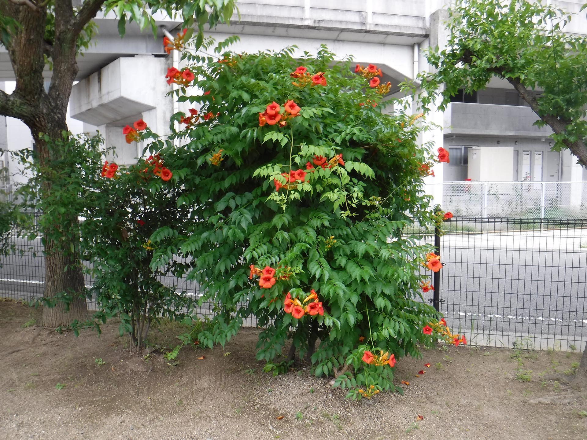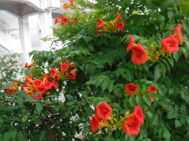山々の緑も雨に打たれて色濃くなり、公園では気根を出して樹木や壁等に付着したノウゼンカズラの花が咲き始めています。ノウゼンカズラの花は、夏から秋にかけて橙色、赤色等のラッパ状の花を咲かせます。ずーっと咲いているように見えますが、一日花でひとつの枝につぼみをたくさんつけて枝元の方から順々に咲いていくので長期間楽しむことが出来ます。