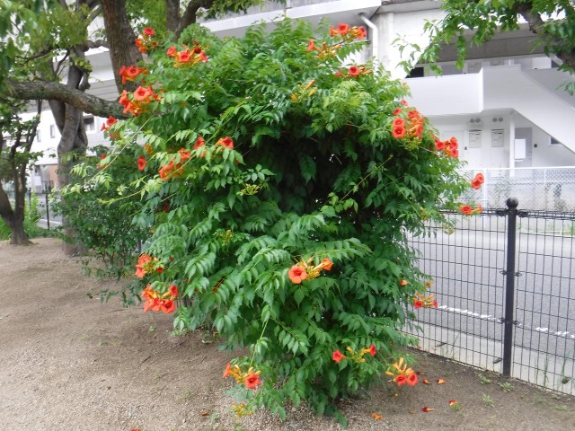 夏の暑い期間、北佐古緑地でノウゼンカズラの花が見頃を迎えています。