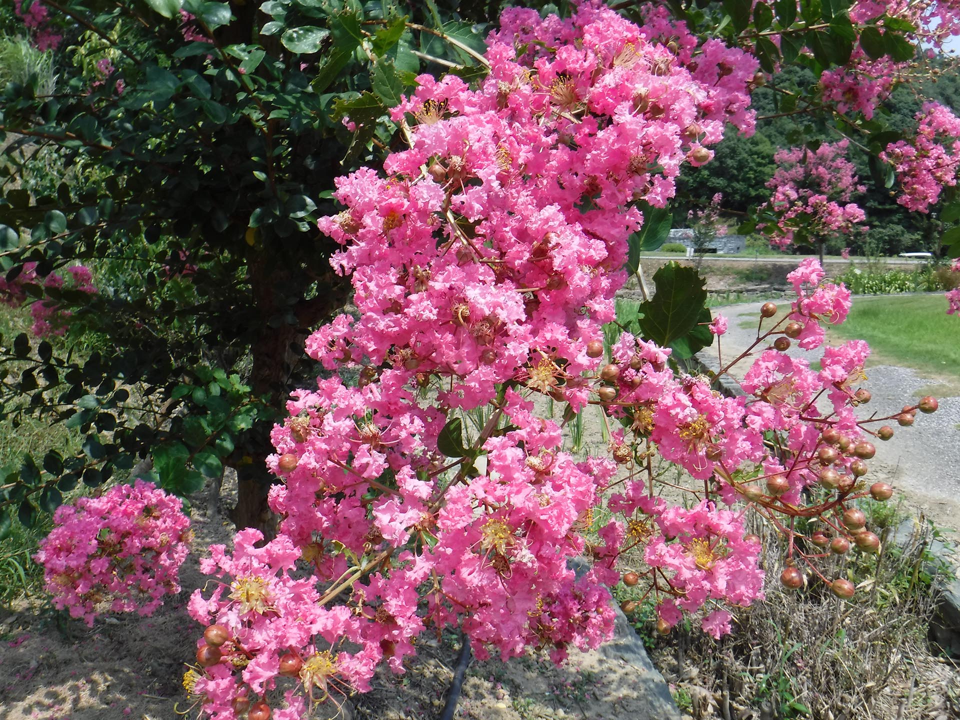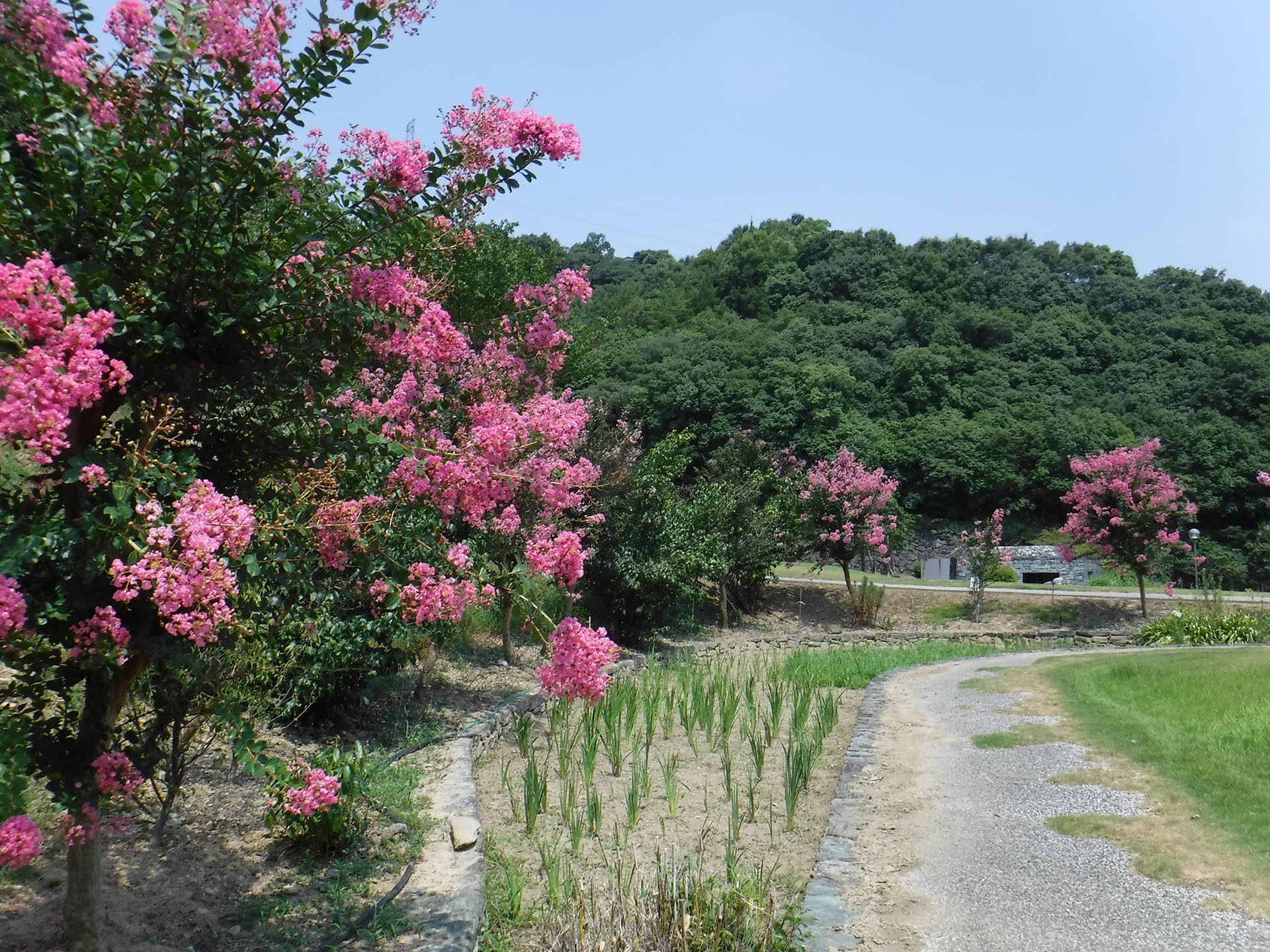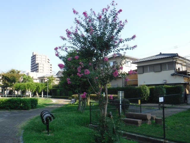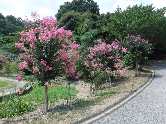夏の日差しが照りつける中、阿波史跡公園、東富田公園、竜王中央公園、佐古駅東緑地等で、花火のようなサルスベリの花が見頃を迎えています。