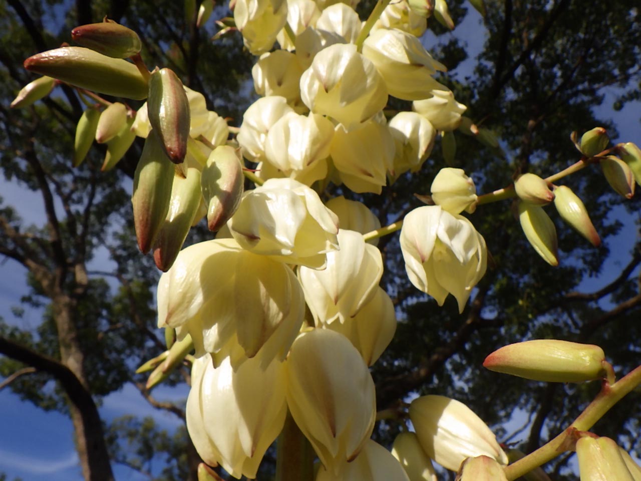 いつの間にか吐く息が白くなる季節となり、冬はもうすぐそこまで来ているようです。寒さにも負けず、ユッカランが葉の間からまっすぐ伸ばした長い花茎に、大きなベル形の白い花をたくさんぶら下げて咲かせています。ユッカランの花は春と秋に二度咲きし、春は5月〜6月にかけて、秋には10月〜11月に花を咲かせます。