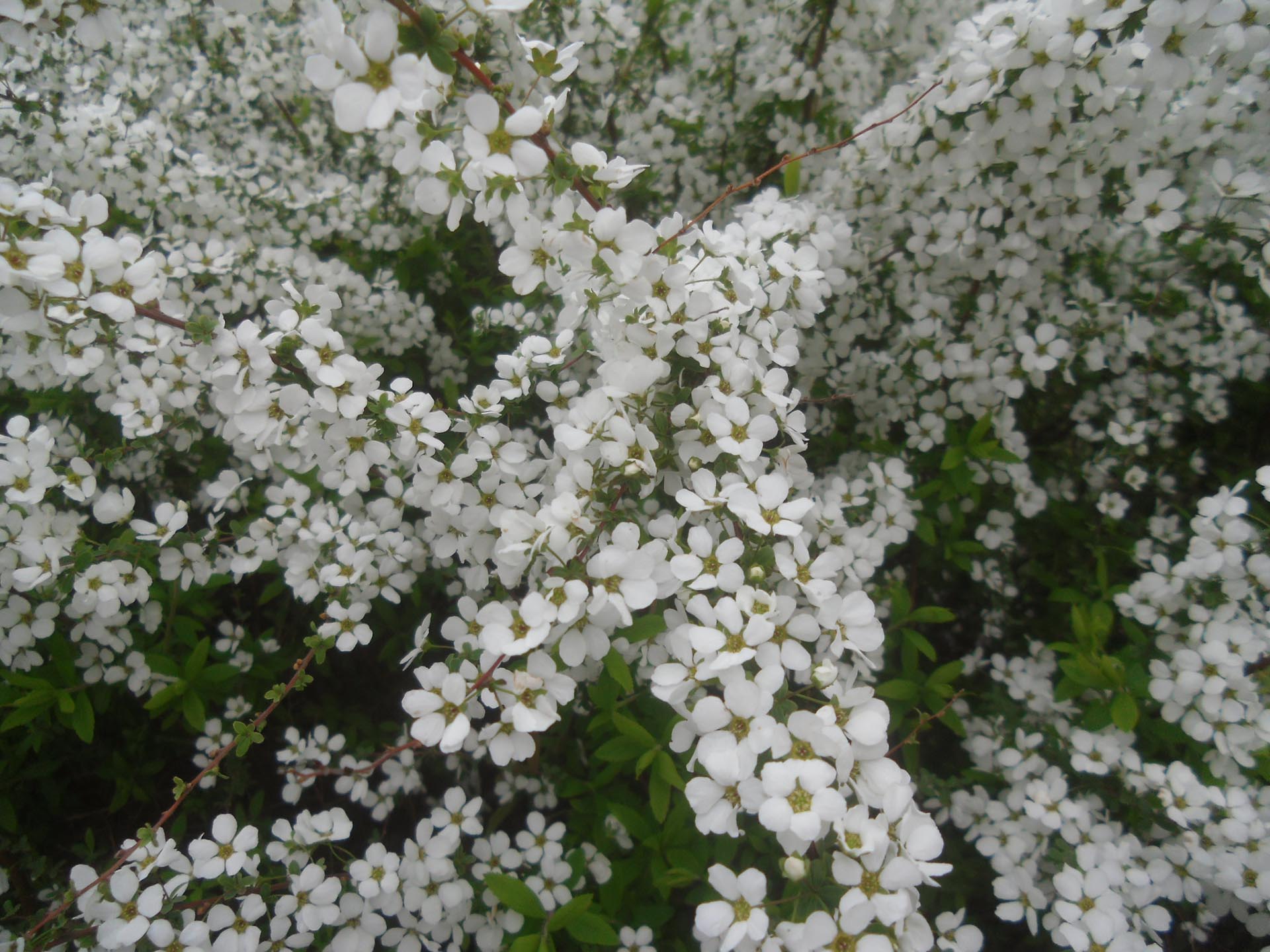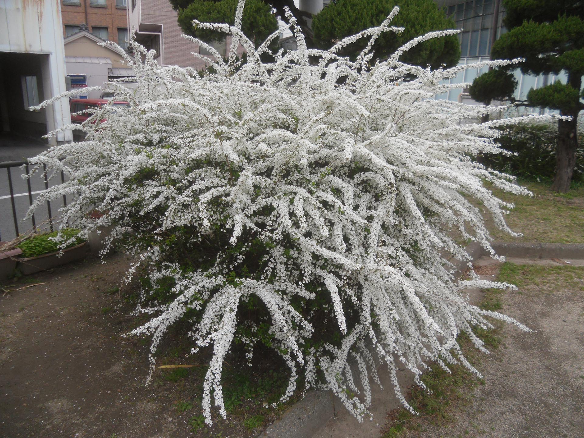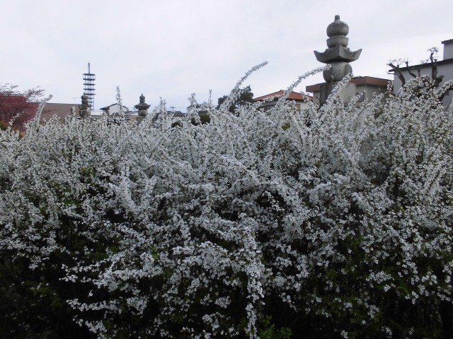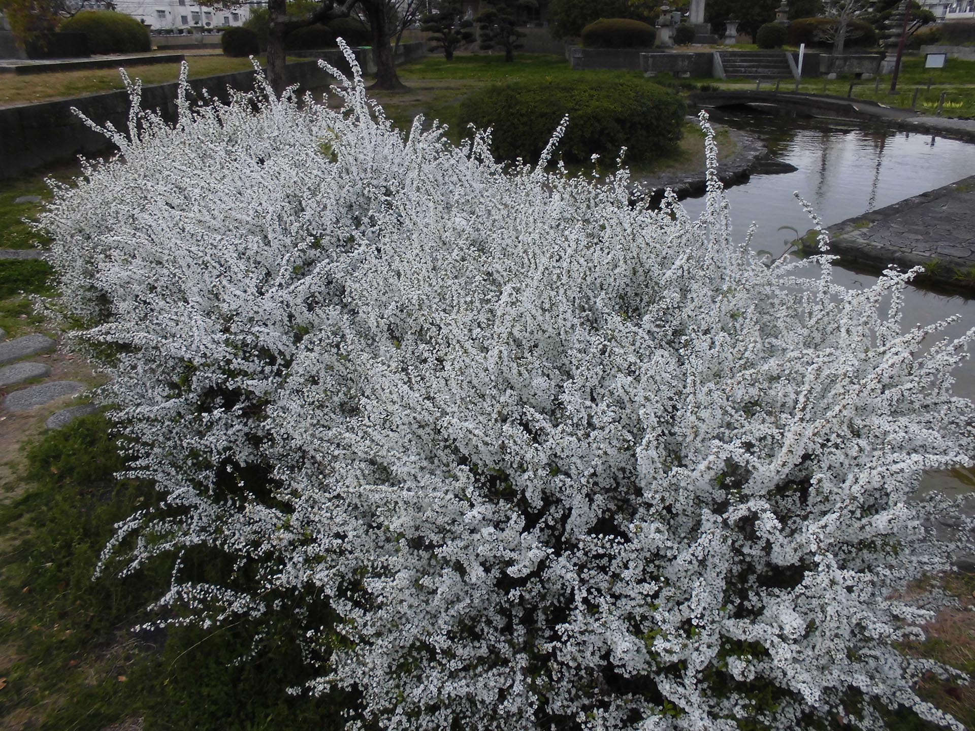 暑さ寒さも彼岸までのことばどうり春の訪れを実感するようになり、地面の際から枝がいく本にも垂れた枝からいっぱいにユキヤナギの小さな白い花が咲いています。その姿から、ヤナギの枝に降り積もった雪のように見え、散ったあとの地面も雪がパラパラと積ったように見えます。