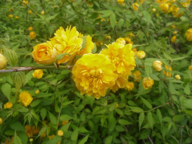 いつのまにか葉桜の季節となり、山や公園等で黄金色に輝くヤマブキの花が咲いています。ヤマブキは、古くから親しまれている花で「万葉集」や「源氏物語」にもたびたび登場しています。ヤマブキの葉っぱは、卵型で緑にギザギザがあり全体に毛が生えています。それと、表面が濃い緑で裏面は淡い緑色をしていることが特徴です。