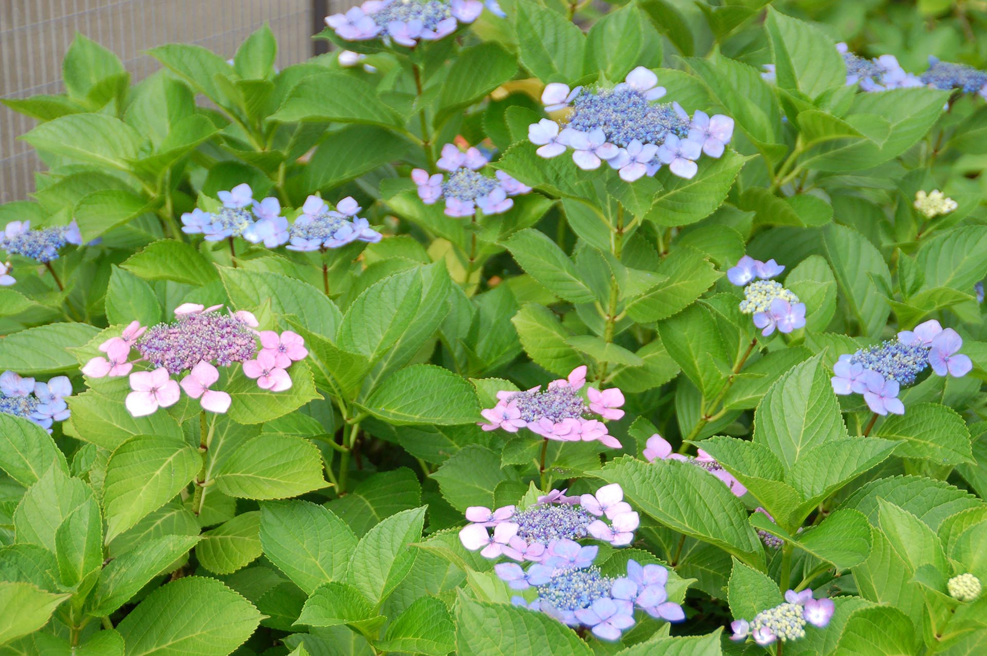 庭のアジサイの花が綺麗な季節となり、小さな花の周りを額縁のように大きな花が囲んでいるガクアジサイの花が咲いています。ガクアジサイの花序の周辺には、4〜5枚の花びらからなる装飾花は花径が4〜5センチと大きく、中央部は花径1センチにも満たない5弁花であり、花の色は白、淡い紅紫、淡い青紫等です。