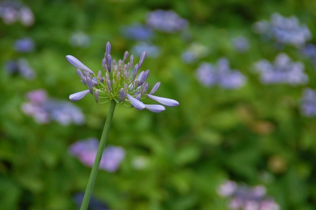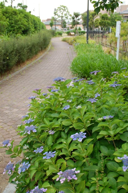 雨に濡れたあじさいの花がひときわあざやかに咲き誇り、佐古駅東緑地ではガクアジサイの花が見頃を迎えアガパンサスの花も咲き始めています。