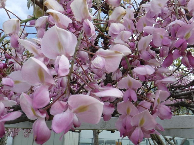 新緑が鮮やかな季節となり、公園や休憩所などのフジ棚から滝のように垂れ下がるフジの花が咲き誇っています。フジは強い日当たりを好み、4月〜5月にかけて紫色、ピンク、白色などの優美な花を咲かせます。