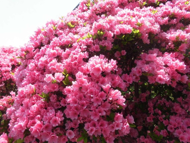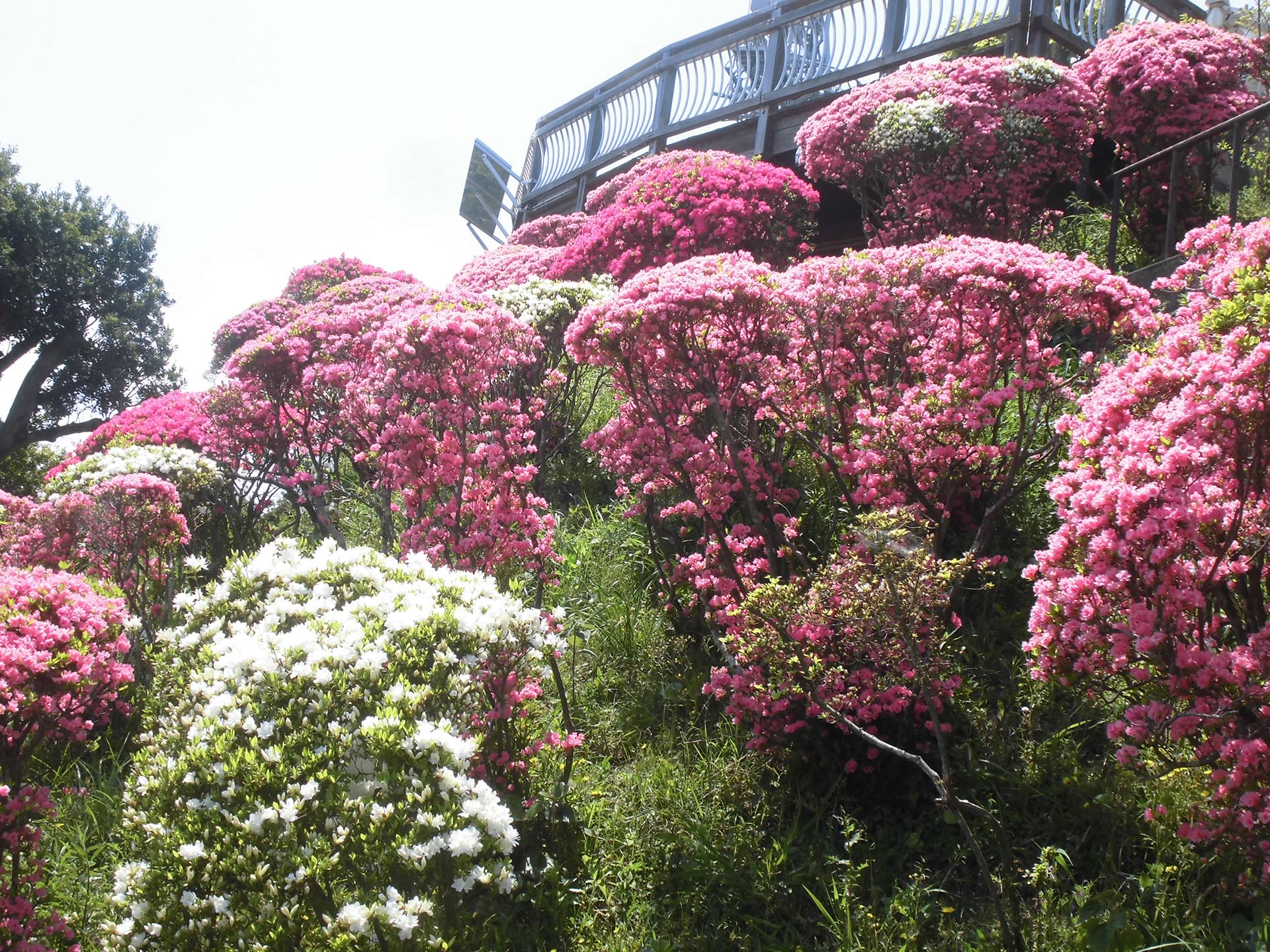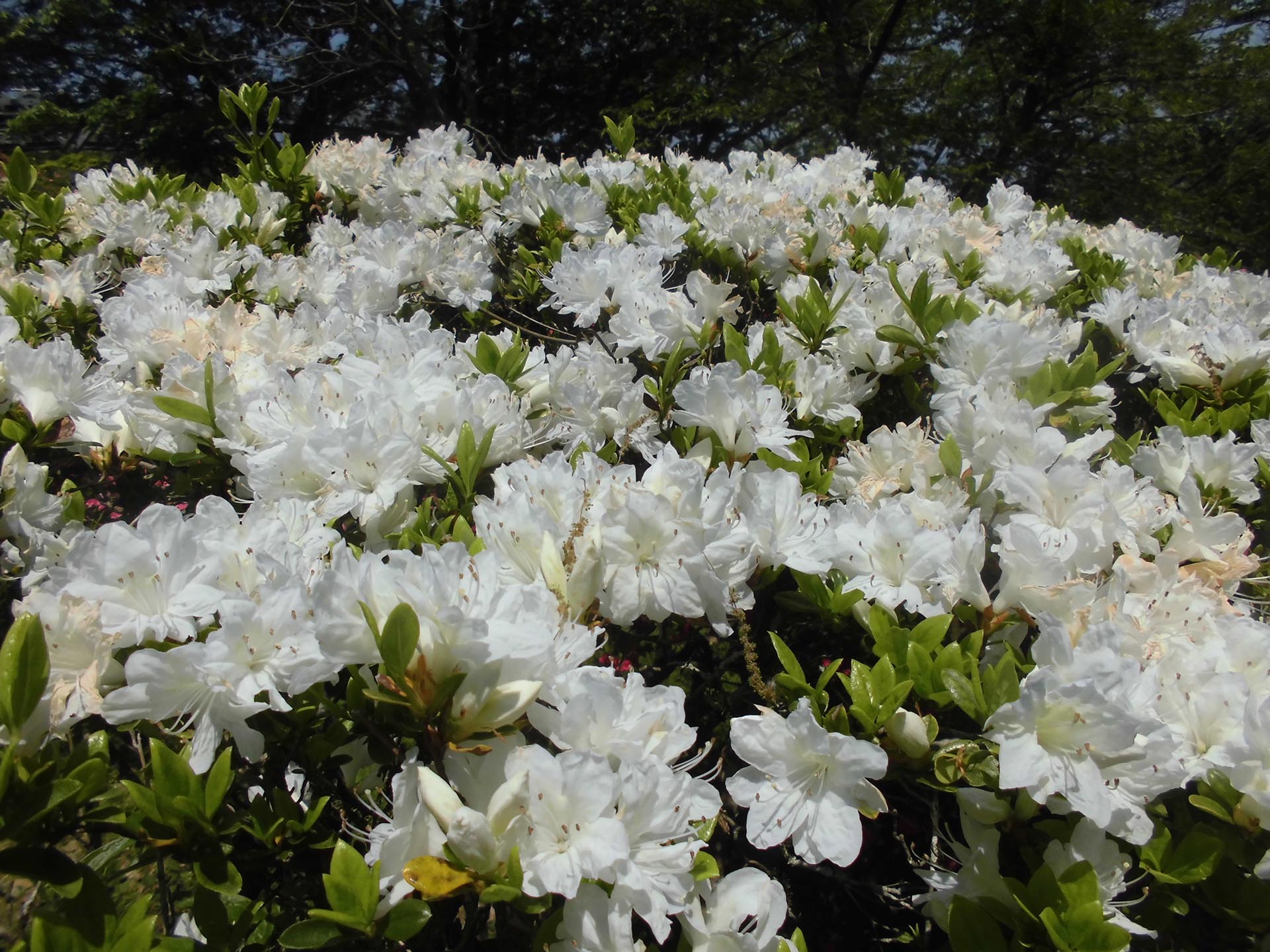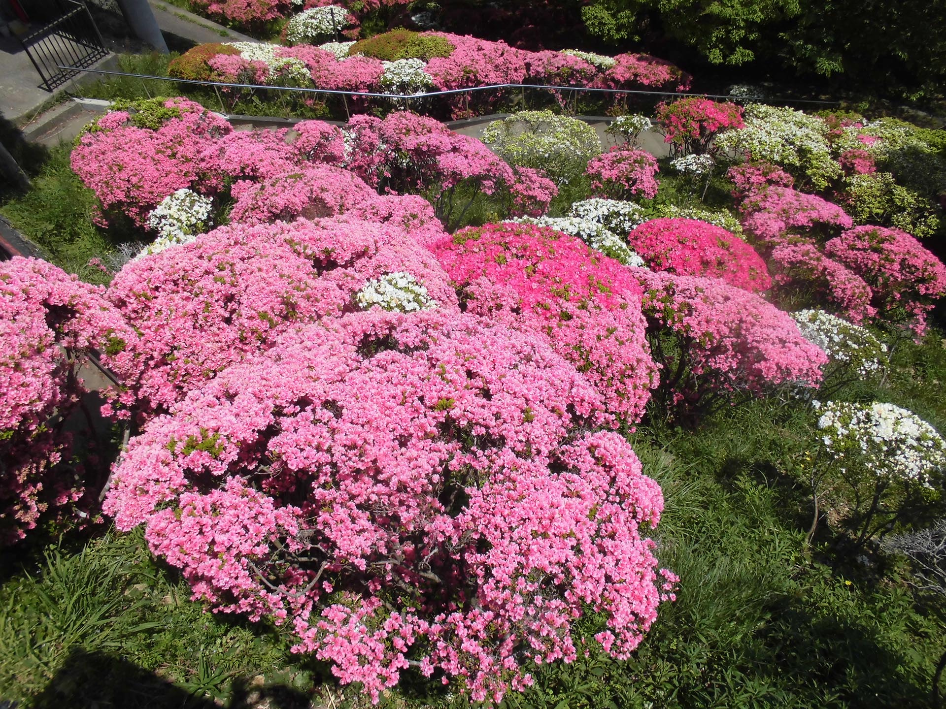 花の盛りもあわただしく去り、いよいよ春も深まりクルメツツジの花が見頃を迎えています。クルメツツジの花は、サツキツツジの花に似ていて、白、淡桃、桃、赤、濃赤、赤、紫と豊富で株を覆うように咲くので、満開の時は本当に素晴らしいものです。