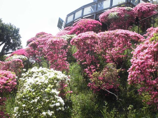春の陽気に誘われ、眉山公園山頂東法面でクルメツツジの花が見事に咲き誇っています。
