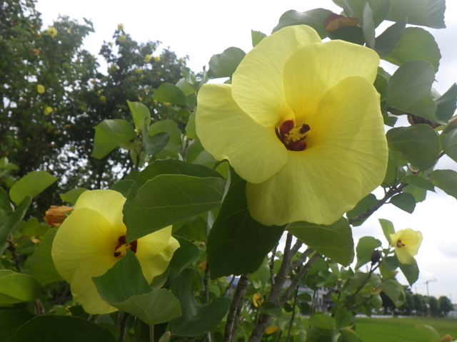 ひまわりが日に日に背を伸ばすこの頃、とても爽やかなハマボウの花が咲いています。ハマボウの花は、朝開いて夕方には咲き終わる一日花ですが、夏の盛りに鮮やかなレモンイエローの花を次々に咲き続けるので、夏の期間楽しむことができます。