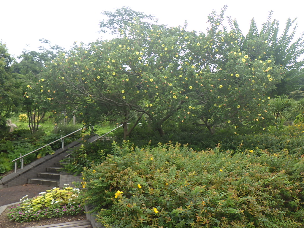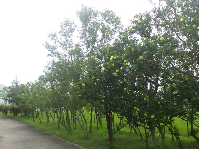 きびしい暑さにもめげず、とくしま植物園、徳島市応神町のハイテクランド徳島南公園で、レモン色の美しいハマボウの花が見頃を迎えています。