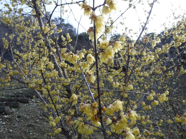 寒の入りとなり冷気がひとしお厳しくなってきましたが、梅に似た黄色いロウバイの花が咲いています。ロウバイの花は、半透明でロウ細工のようなツヤのある香り高い花です。
