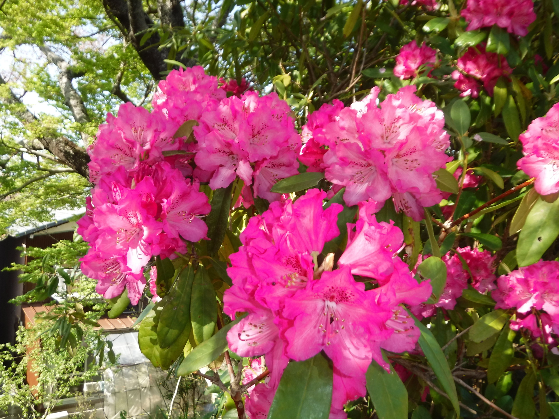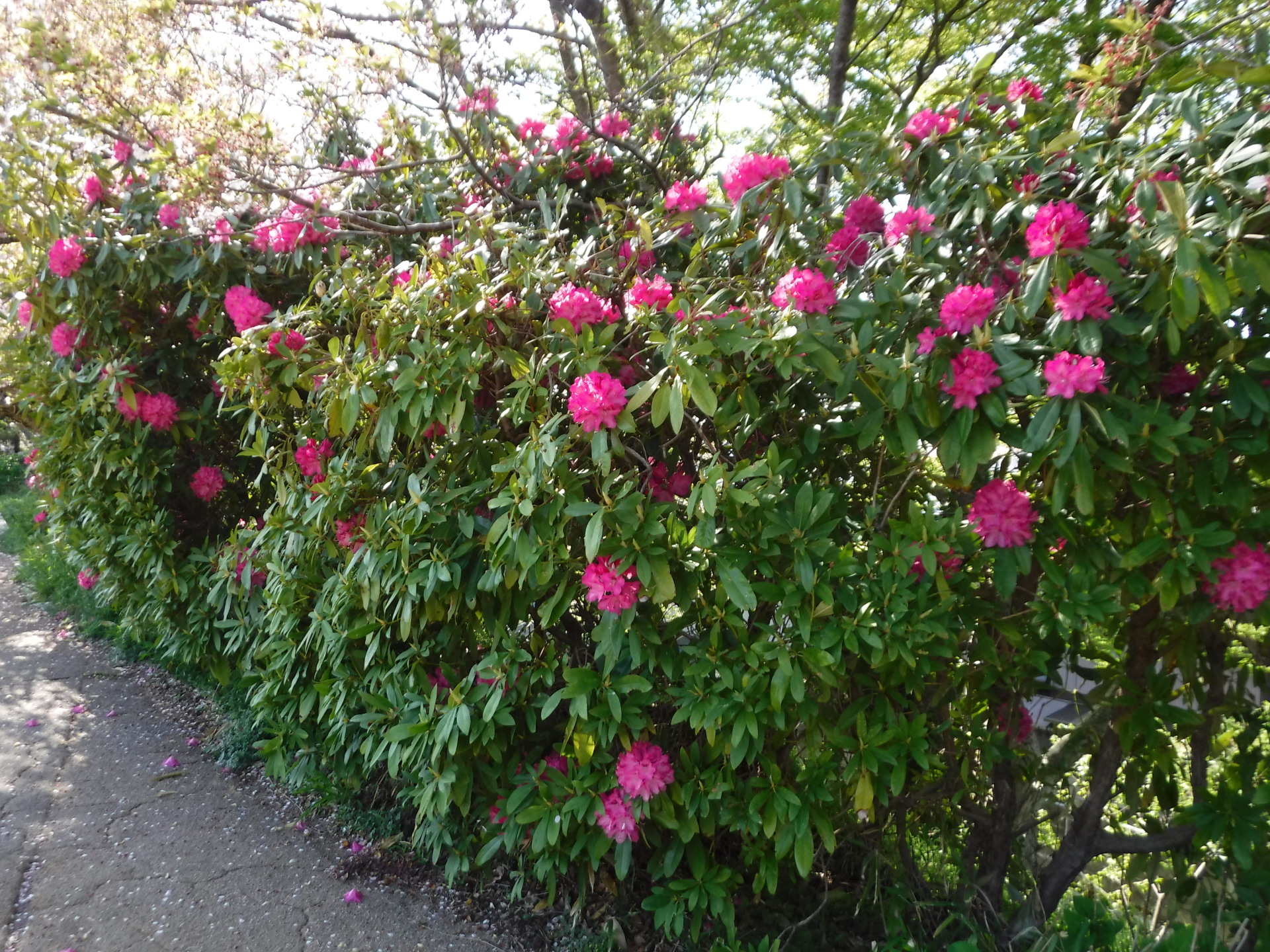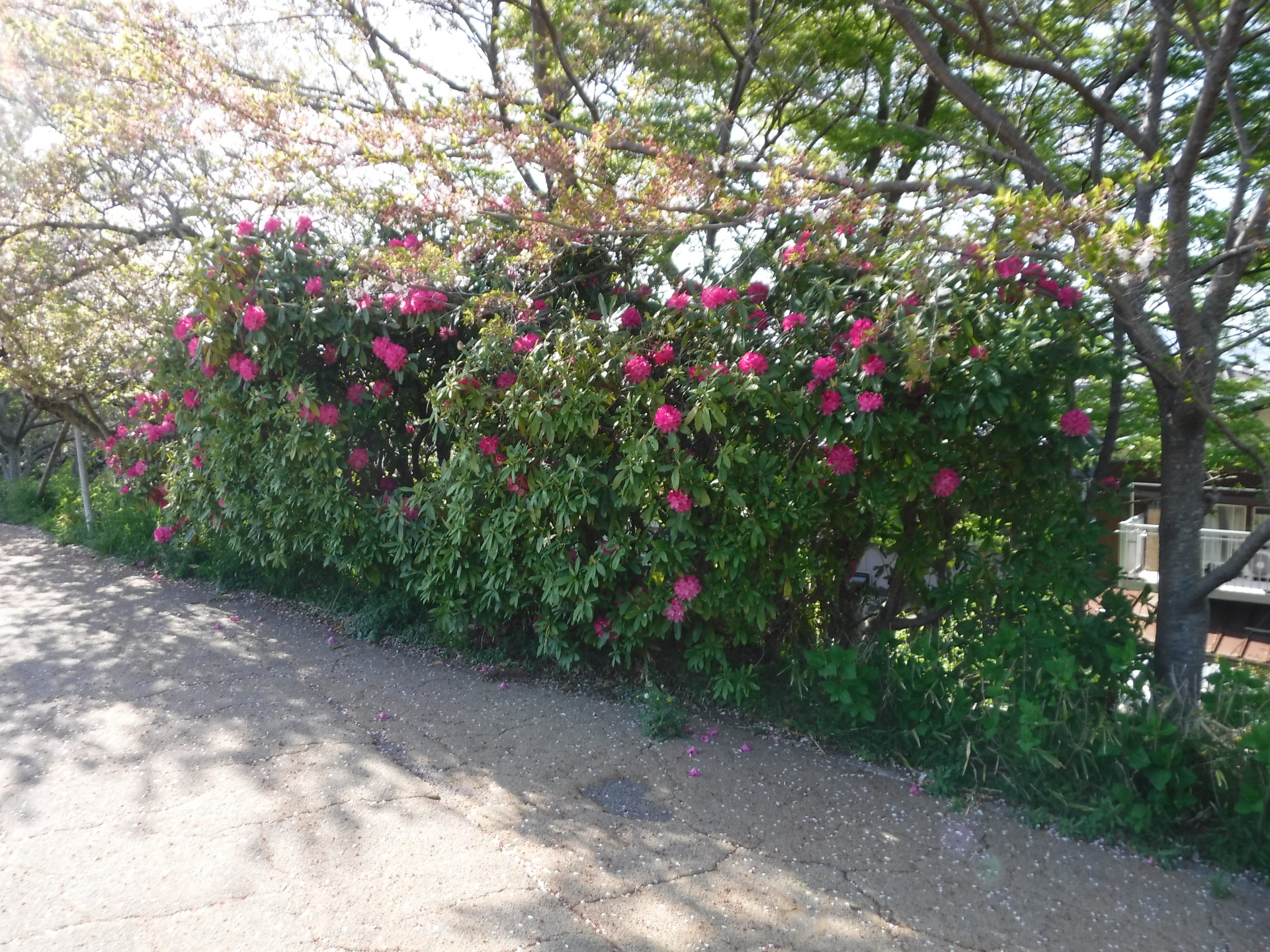 桜の季節もいつしか過ぎてすっかり葉桜の季節となり、直射日光の当たらない半日陰でセイヨウシャクナゲの花が咲き誇っています。セイヨウシャクナゲは、自生しているニホンシャクナゲに比べると花が大きく花色もカラフルで、赤、白、黄色、ピンクなどの見事な花を咲かせます。