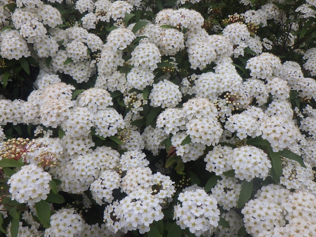 吹く風も爽やかな好季節を迎え、細い枝にひとかたまりとなって小さな手まりのようなコデマリの花が咲いています。コデマリの花は、葉っぱが見えないほどびっしりと花を咲かせ枝が垂れる姿はとても美しいです。