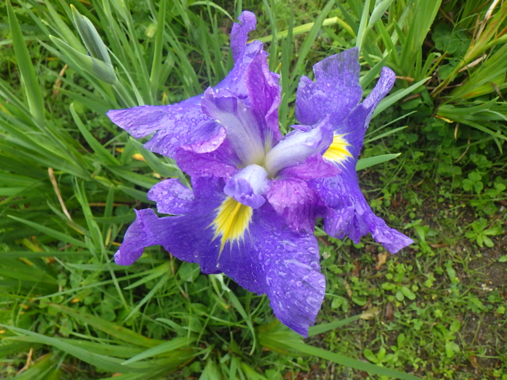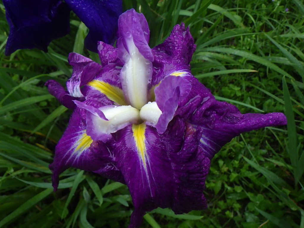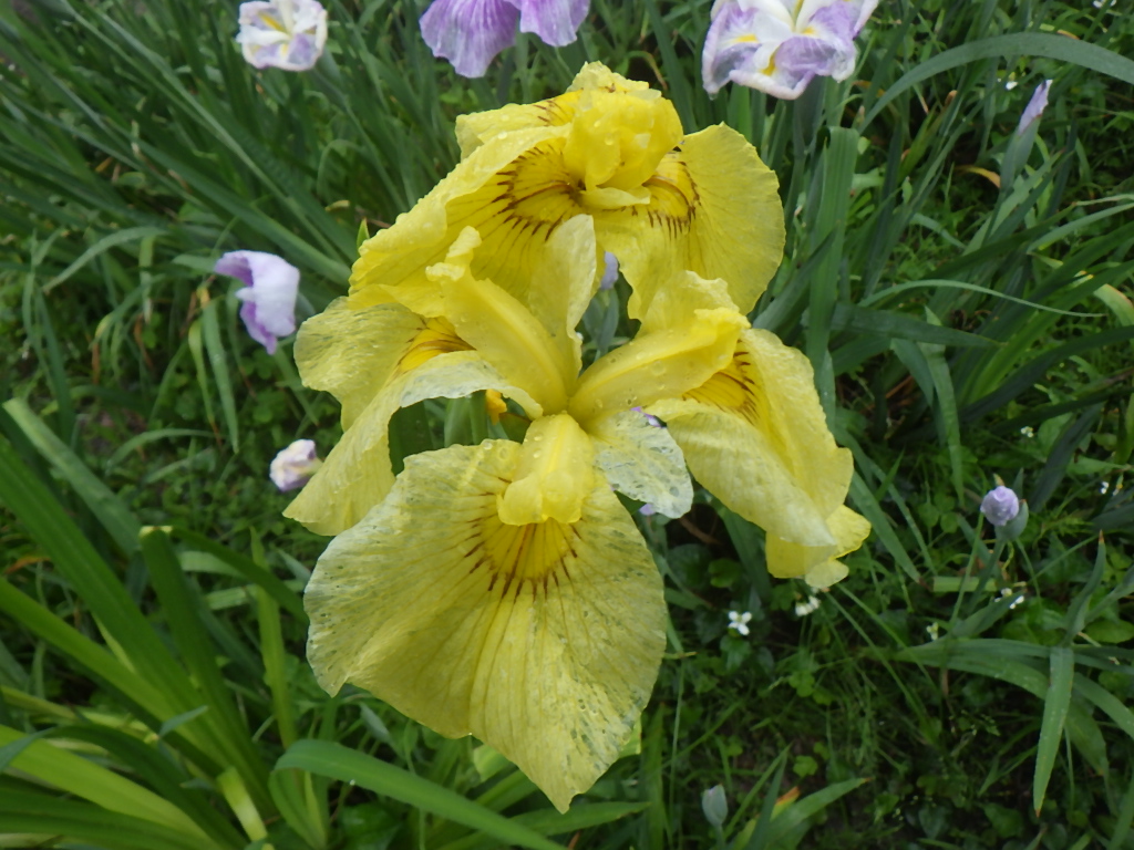 春から夏へとうつろいゆく季節、花々に囲まれ美しいハナショウブの花が咲き始めています。ハナショウブの花は、5月下旬から6月中旬で花弁の元にはっきりとした黄色の菱模様があり、花の色は白、桃、紫、青、黄色など数多くあります。