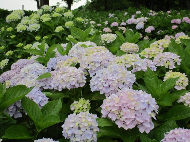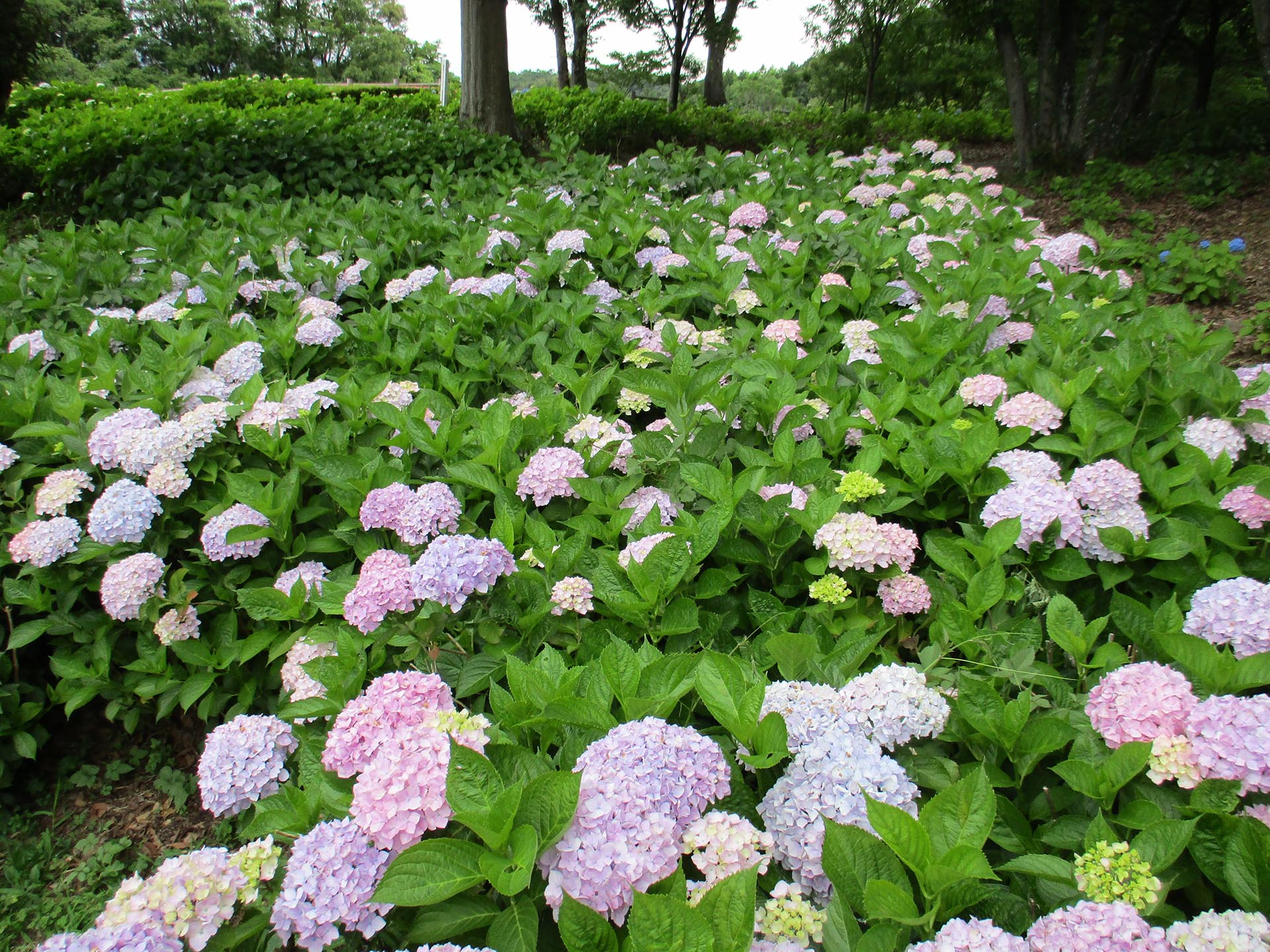梅雨晴れの青空の下、とくしま植物園、西部公園、地蔵院池緑地、末広公園等でカラフルにアジサイの花が咲き誇っています。