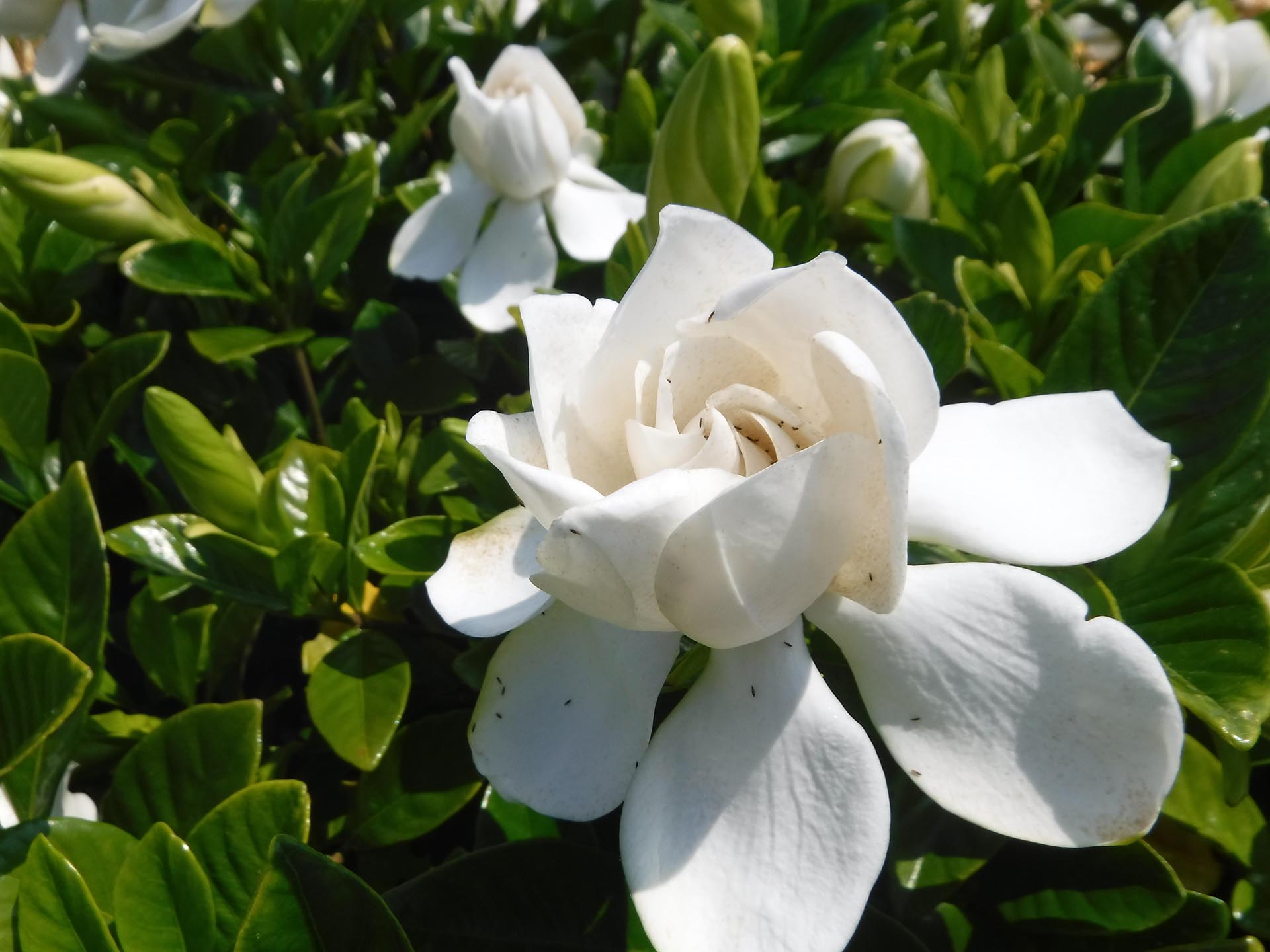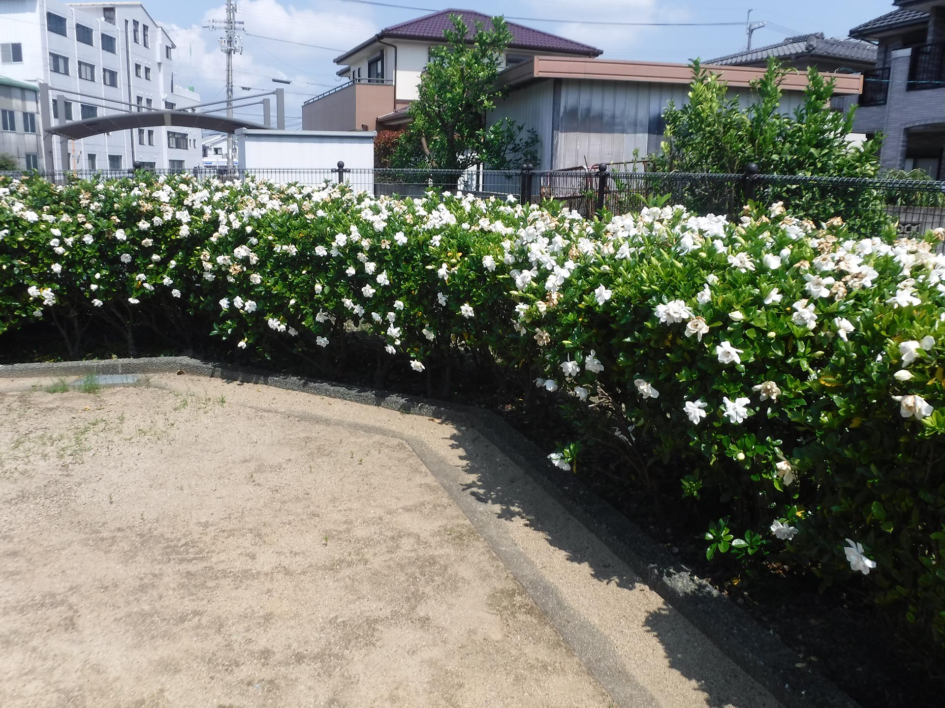 梅雨晴れの青空を待ちつつ、応神瑞川公園でクチナシの花が見頃を迎えています。