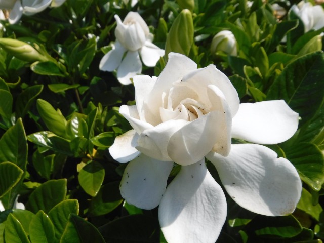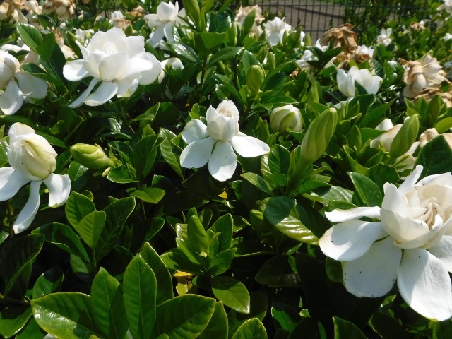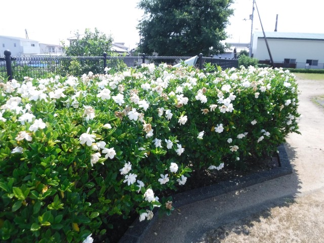 早いもので今年もそろそろ半分が過ぎようとしていますが、遠くからでも香ってくるクチナシの花が咲いています。クチナシは梅雨時に大型で純白の6弁花を咲かせ強い香りを漂わせています。開花当初は白色ですが徐々に黄色に変化していきます。花はジャスミンに似た甘い香りを放ち、キンモクセイやジンチョウゲと共に三大芳香木とされています。