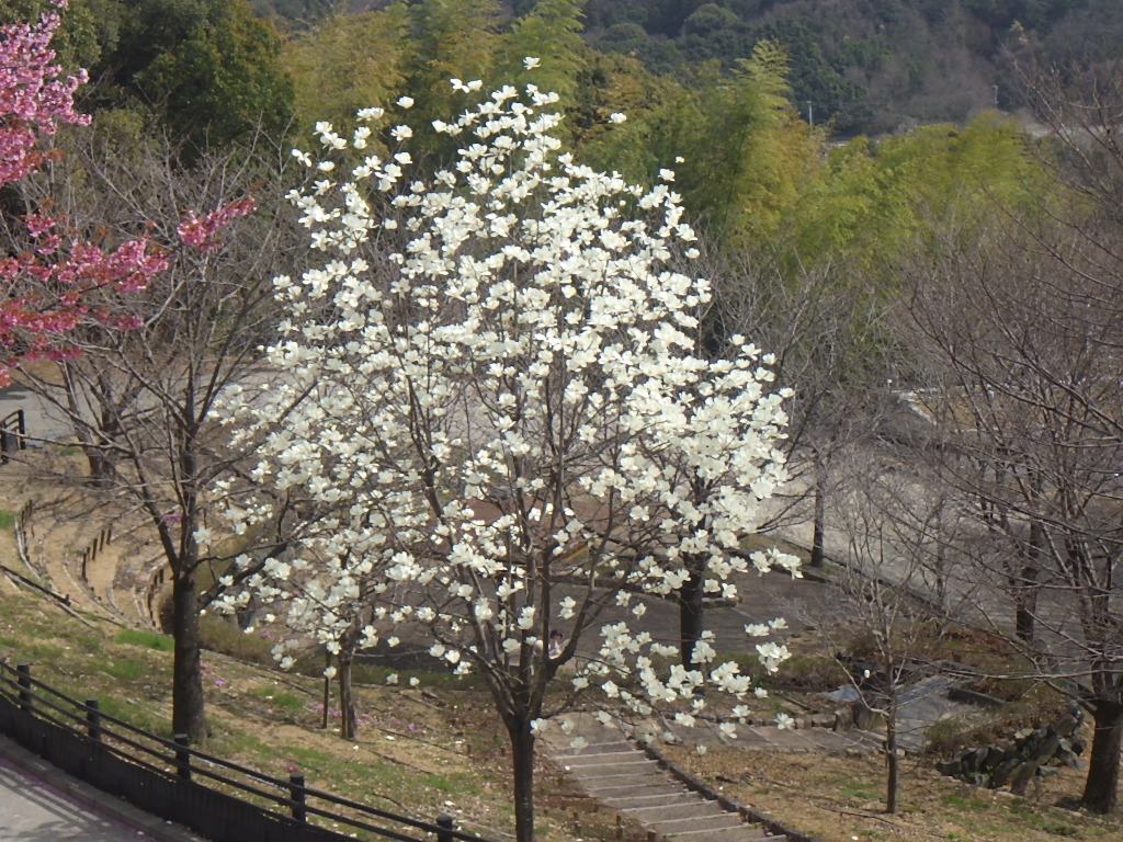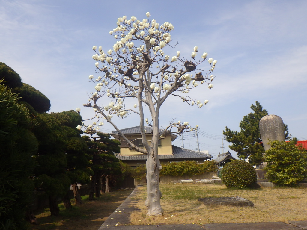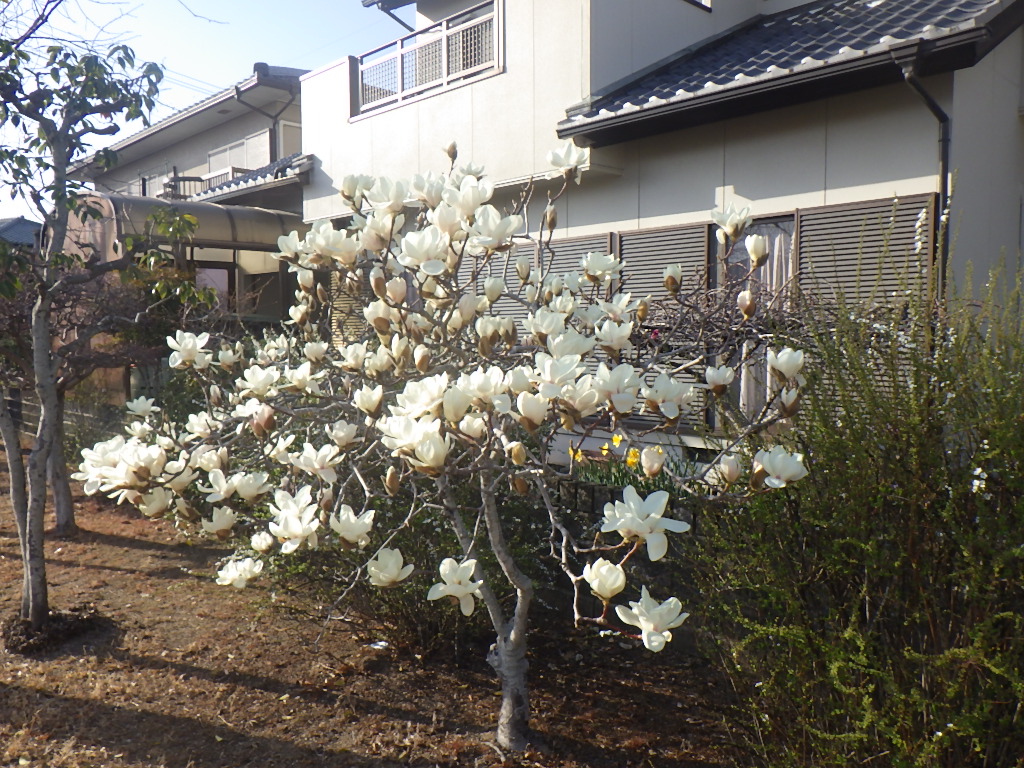 春寒も緩みはじめようやく過ごしやすい気候となり、ハクモクレンがいっぱい花を咲かせています。ハクモクレンの開花した花は、3~4日ほど楽しめ暗くなると閉じる習性があります。また、つぼみが必ず北を向いていることから、「コンパスフラワー」とも呼ばれています。