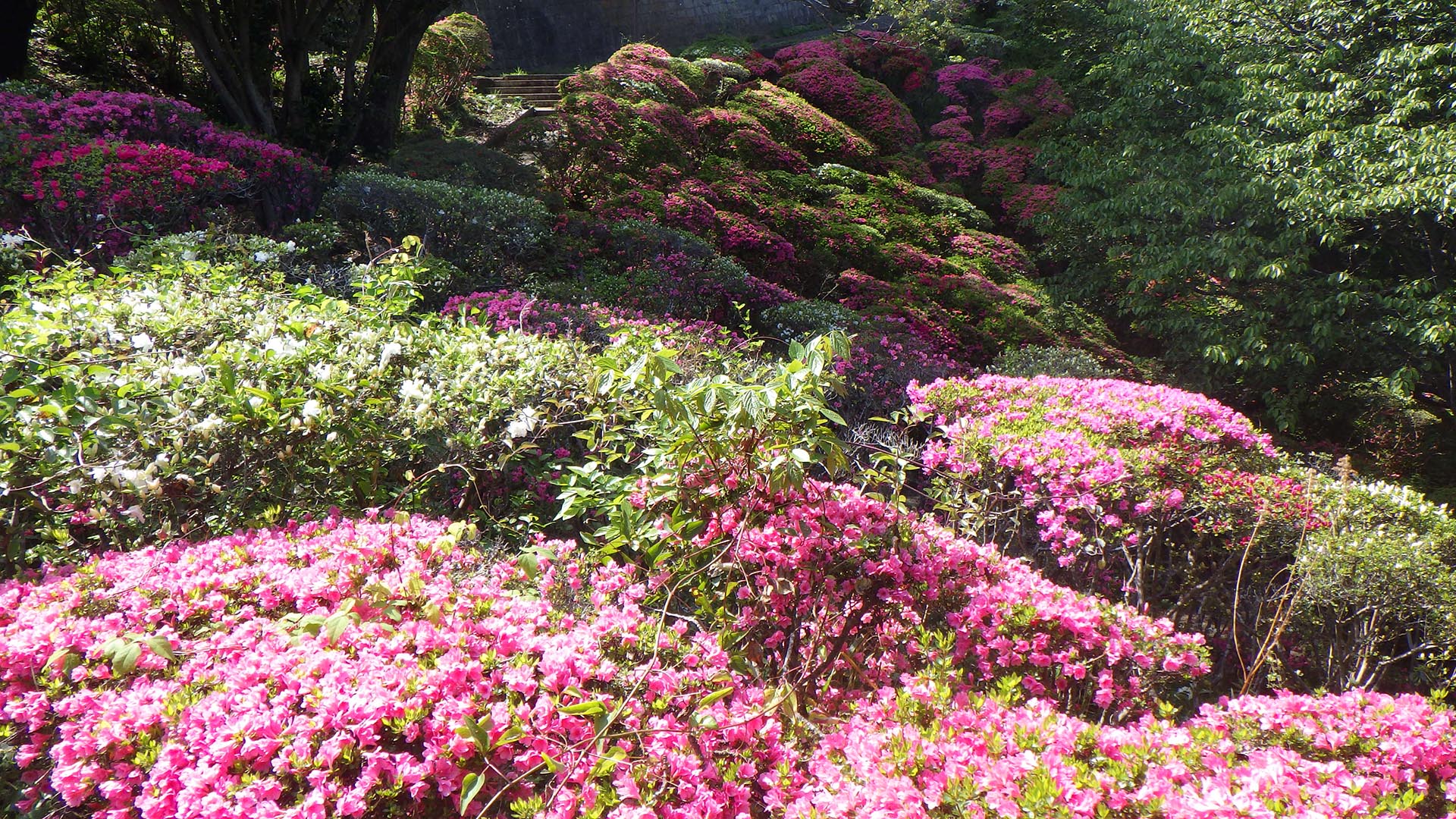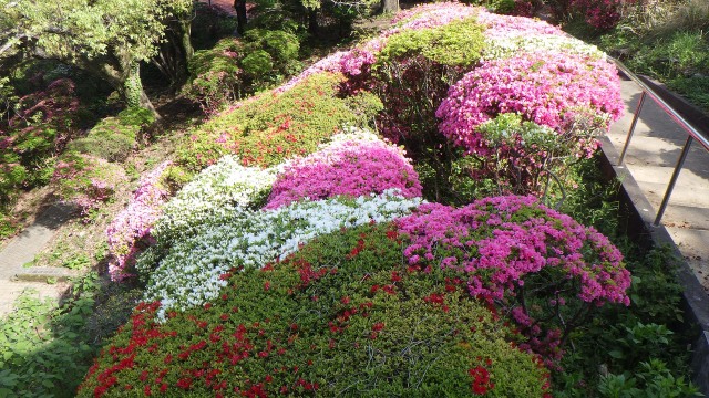 早足に桜の季節も過ぎつつじが美しく咲くころとなり、株を覆うように一斉にクルメツツジが誇らしげに花を咲かせています。クルメツツジの花は、一般に小輪ですが花付きがすばらしく白、淡桃、桃、赤、濃赤、赤紫と豊富で色鮮やかに開花すると木全体にびっしりと花を咲かせるため、見ごたえがあります。また、花の色が美しいため、葉の緑とのコントラストも楽しめておすすめです。