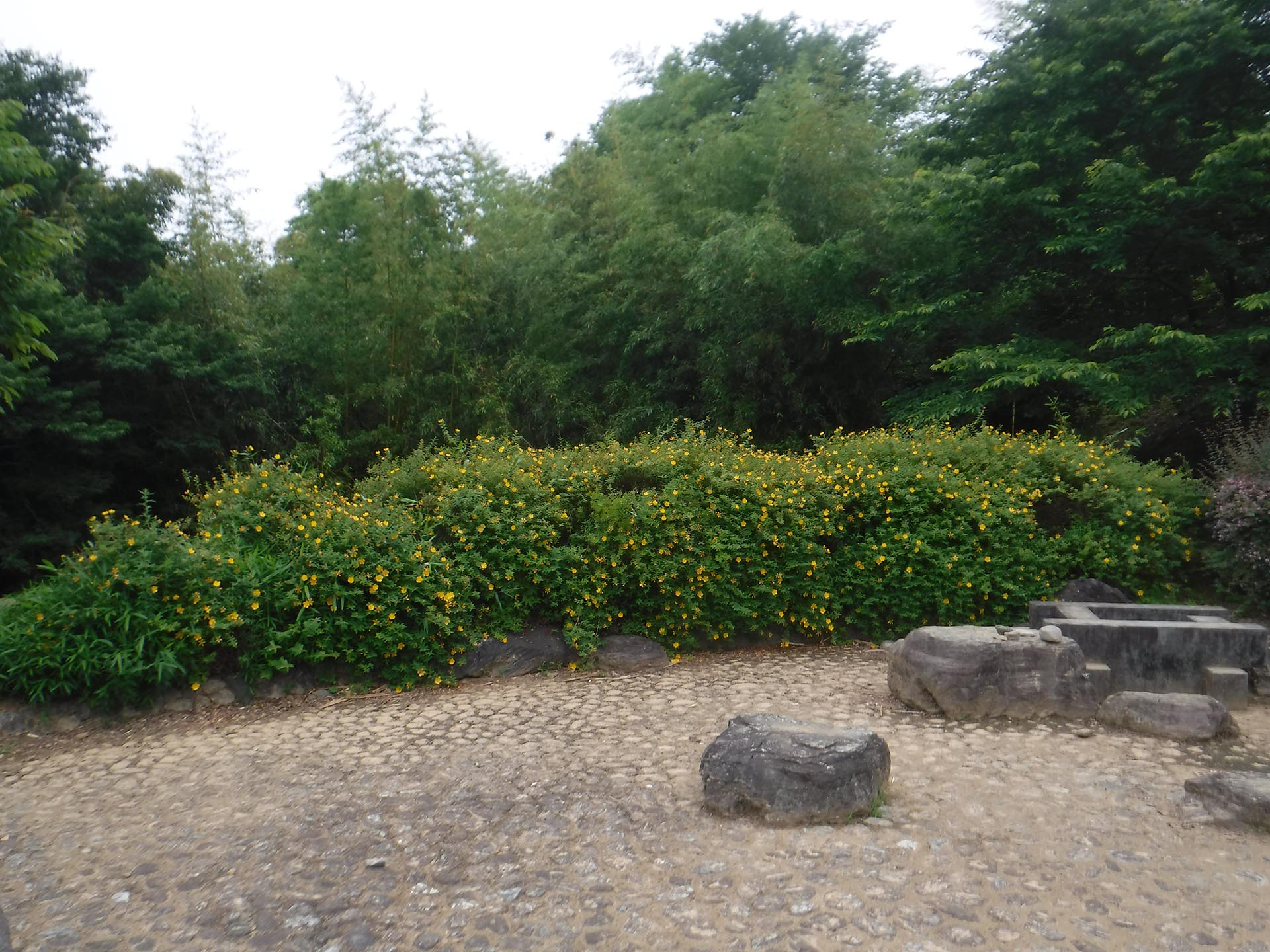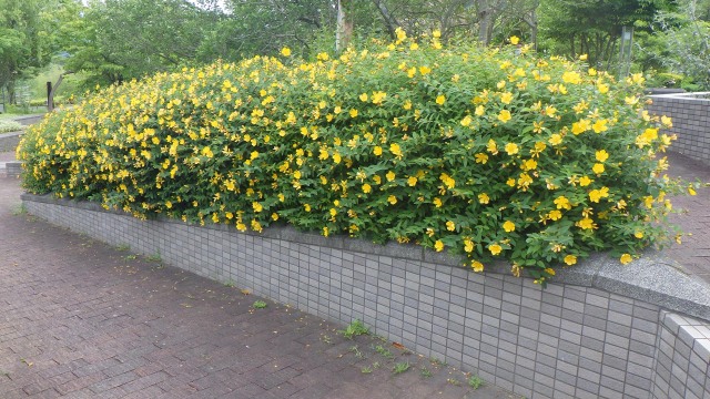 衣替えの時季を迎え、道行く人々の装いにも夏らしさが感じられるころとなり、株一面にタイリンキンシバイの花が咲き始めています。タイリンキンシバイの花は、黄色い丸味のある五弁の花でやや上向きに花を咲かせます。
