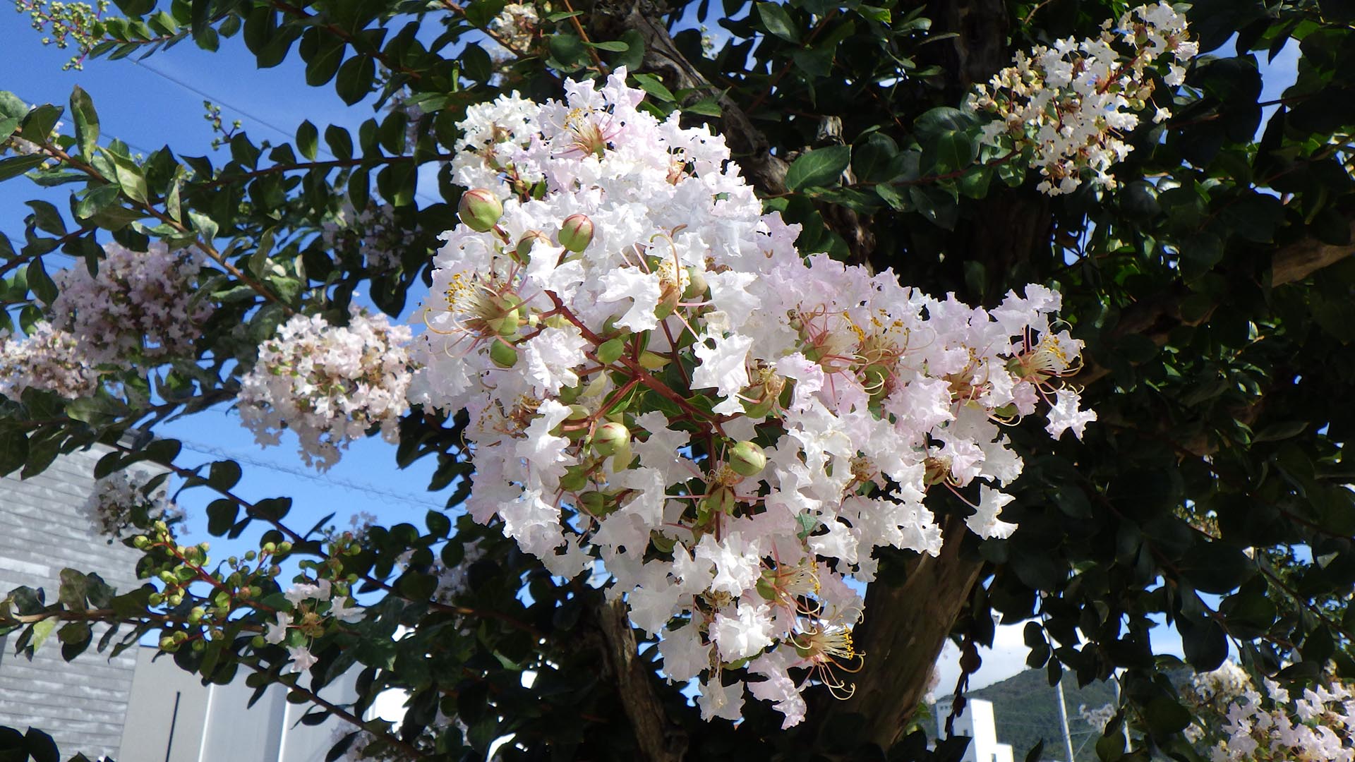 夏祭りの季節を迎え、浴衣姿で歩く人を見かけるようになり青空の下でサルスベリの花が咲いています。サルスベリの花は、ピンクや白、濃い紅紫、紫色の花を咲かせ、花びらの縮れた小さな花がまとまって穂のように咲き、夏から秋まで美しい花姿が楽しめます。また、日当たりと風通しのよい場所を好み、日陰に植えるとほとんど花が咲かなくなります。