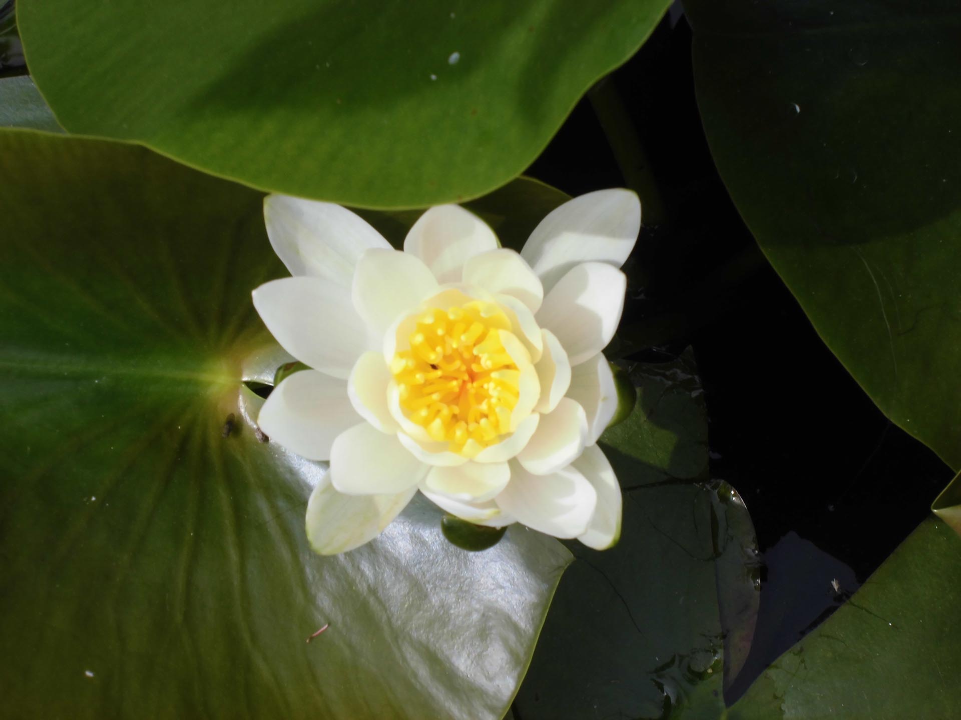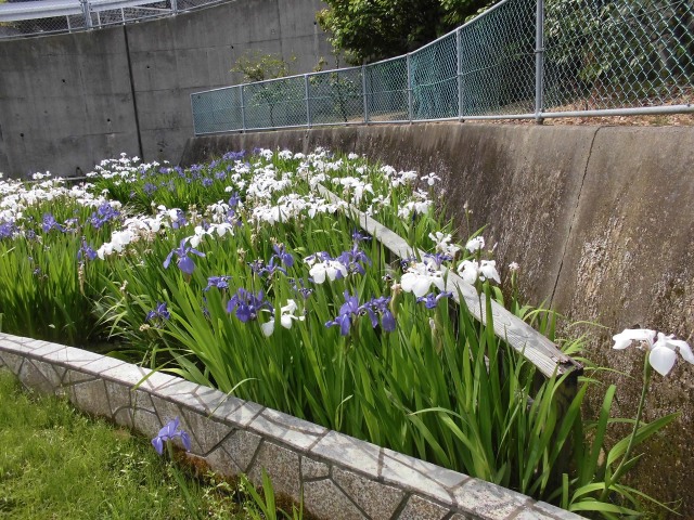 現在、一宮公園でカキツバタが、上品な白色の花と鮮やかな青紫色の花が見頃です。また、水面でもスイレンの白い花が咲いています。