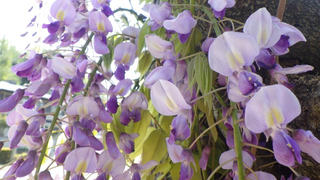 桜の見頃も過ぎ、あっという間に葉桜の季節となりましたが、かんざしのような長いフジの花が、下垂させて咲いています。フジの花は、頭上から降り注ぐように咲く姿が非常に幻想的で上の方から咲き始め、長い房状の花の先端が咲く頃には上の方の花が萎れ始めているので、上の方の花が開いていて下の花はまだ少しつぼんでいるくらいが見頃だと言えます。