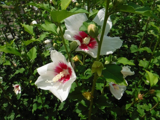そろそろ仕事終わりのビアガーデンが恋しい季節となり、ムクゲが白、ピンク、赤、紫などの色鮮やかな花を咲かせています。ムクゲの花は、梅雨のころから咲き始め、早朝に花を開かせ夕方にはしぼんでしまう1日花ですが、新たな花が次々と咲き続け夏から秋にかけて長期間楽しむことができます。また、ムクゲの花は咲き方も多様で、一重咲きの他に八重咲き、さらには乱れ咲きまであります。