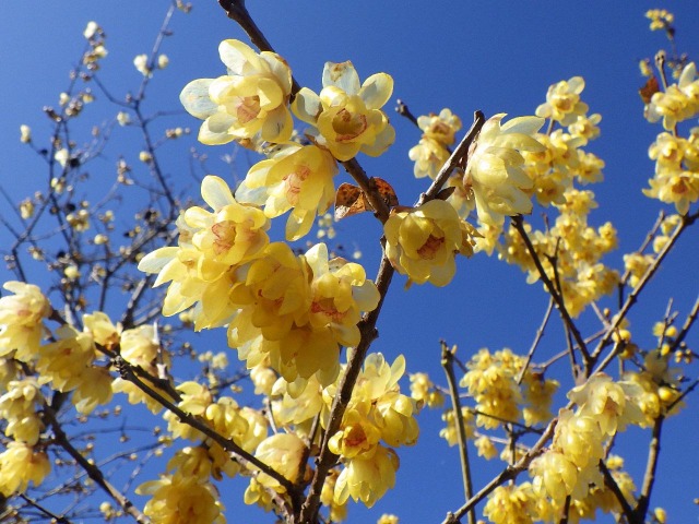 松の内の賑わいも過ぎて普段通りの生活に戻り、花の少ない寒い時期にろうばいが花を咲かせています。ろうばいの花は、控えめで奥ゆかしい淡い黄色で香りが良く、花びらには厚みがあり、ロウでコーティングしたような花です。