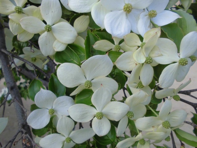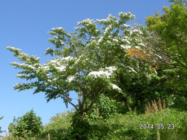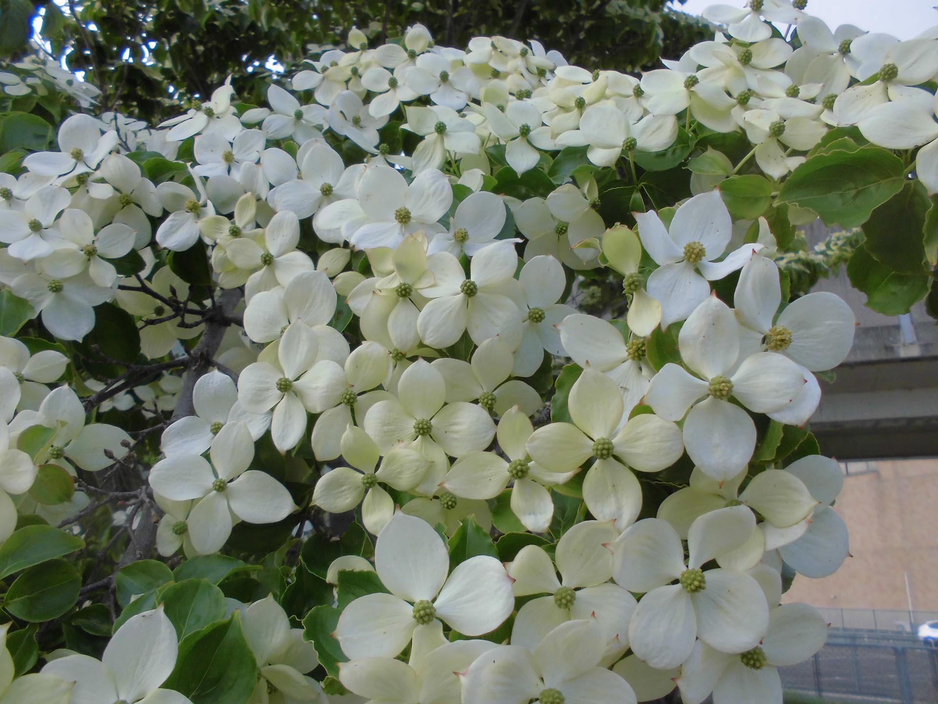初夏を感じる季節となり、ヤマボウシが枝の先に4個の総包片といわれる特殊な葉をつけており、白い花弁のように見えています。ヤマボウシの総包片は、ハナミズキの総包片とよく似ています。ハナミズキの総包片は卵形で先端がへこみ、ヤマボウシの総包片は先端がとがっています。ヤマボウシの本当の花は、6〜7月に淡黄色で小さく、多数が球状に集合して咲かせます。