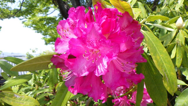 桜の花が散り葉桜の季節となり、多彩にセイヨウシャクナゲの花が彩っています。セイヨウシャクナゲの花は大きく、花色もカラフルで枝先に咲くのが美しく満開の時期は見ごたえがあります。