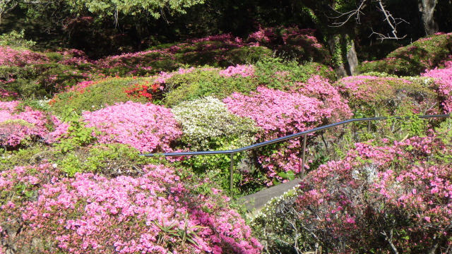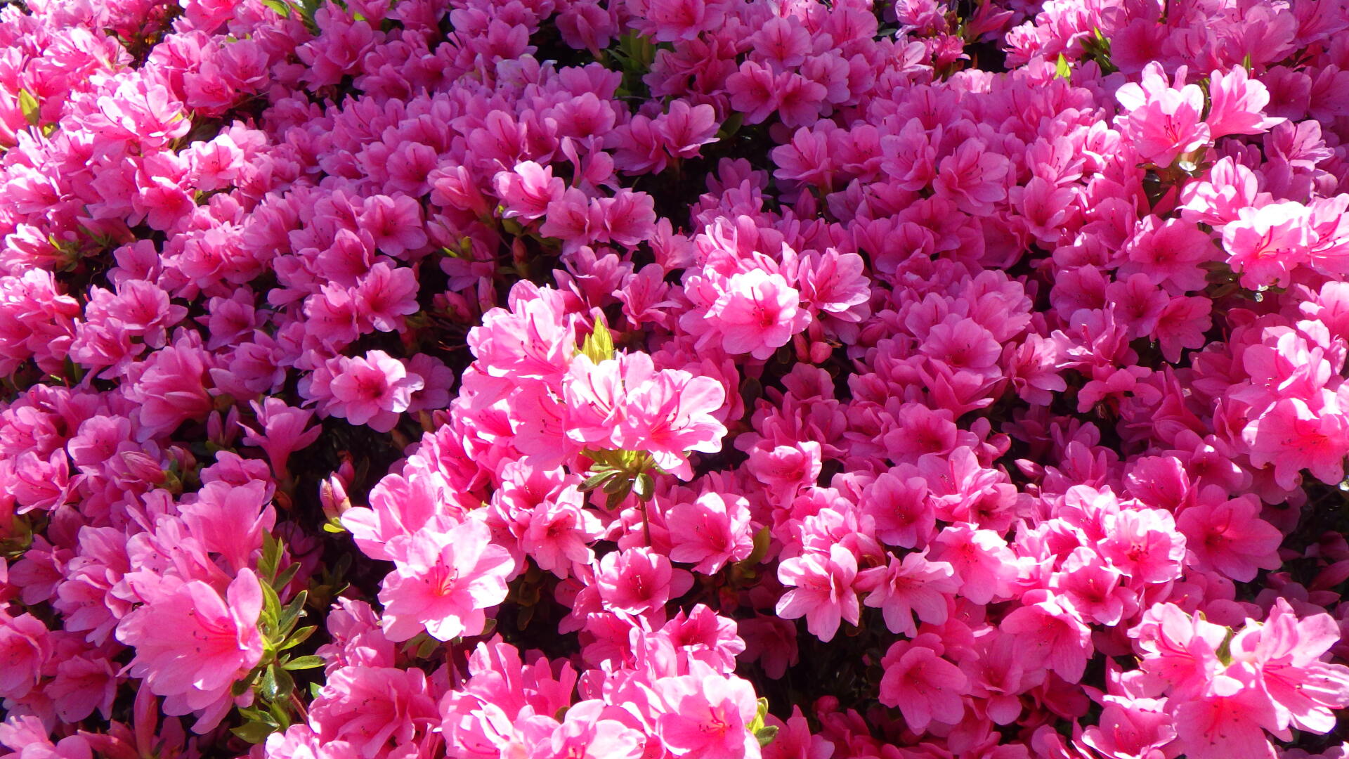 赤や濃いピンクが株びっしりと咲くクルメツツジの花