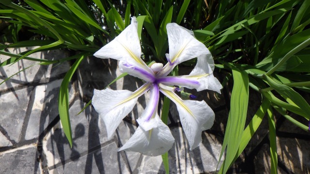端午の節句を迎え、水辺にカキツバタの花が咲いています。カキツバタの花は、長い花茎の先端に青紫色の花が2〜3個付きます。花は12センチ程で、花被片は6枚あり内花被片は直立し、外花被片3枚が垂れ下がり基部に白〜クリーム色の筋が入ります。