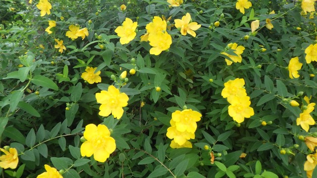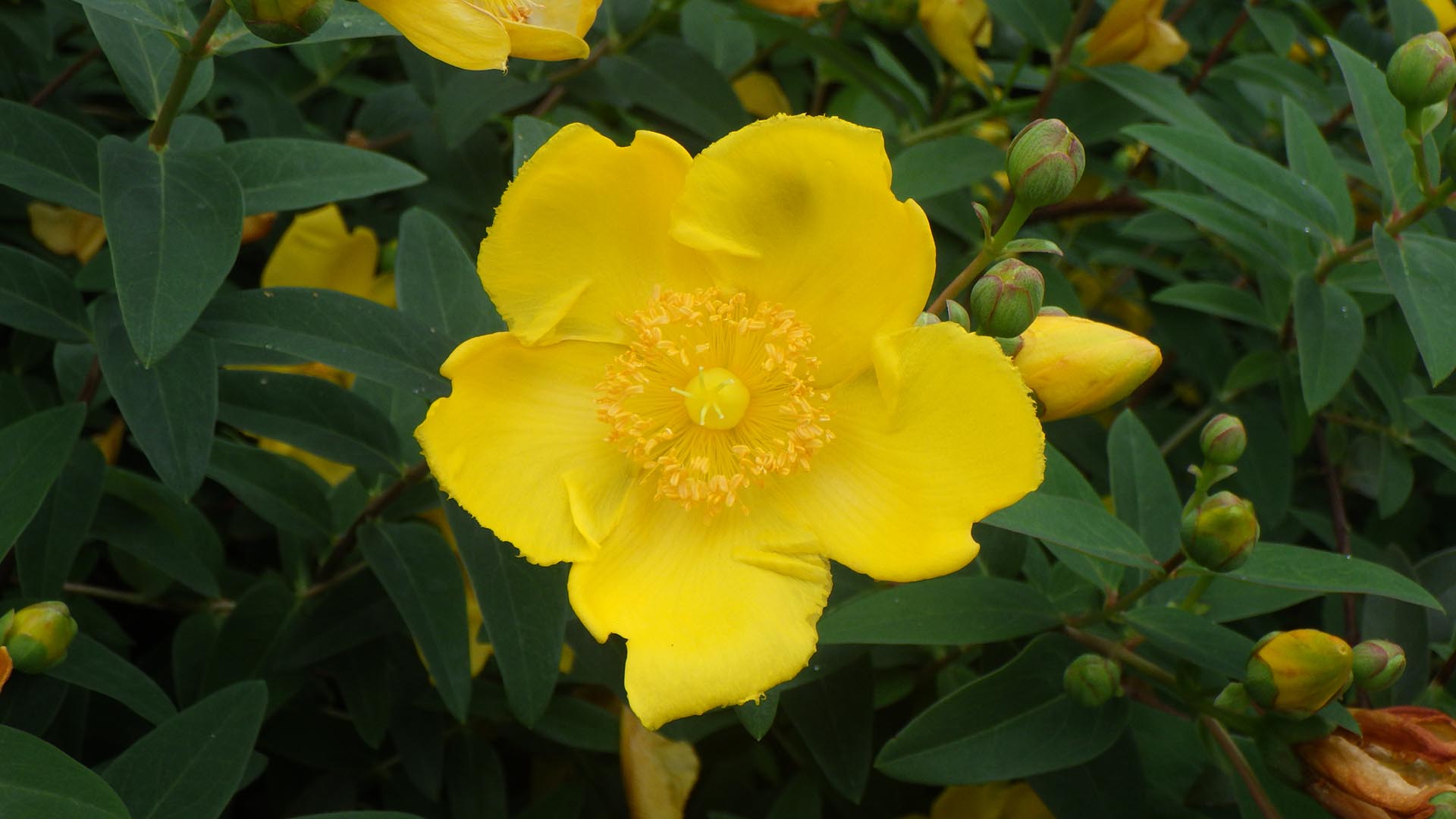 衣替えを前に、長袖にしようか夏服にしようか、着るものに困る季節となり、鮮やかな黄色のタイリンキンシバイの花が咲いています。タイリンキンシバイの花は、茎先に数輪の花がつくので開花時はとても華やかで、その花がいっぺんに咲くのではないため開花期間も長いのが特徴です。