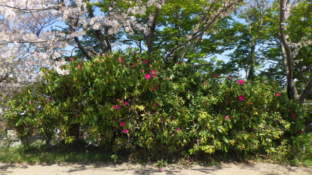 春の花が美しく咲き乱れる季節となり、半日陰で西洋シャクナゲの花が咲いています。西洋シャクナゲの花は、大きく豪華で色の種類も豊富であり、ピンク、白、赤、黄、オレンジ、紫など多彩な色彩を楽しめます。