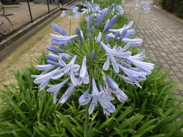 吹く風にも、いよいよ夏の気配を感じるころとなり、アガパンサスの青紫色の花が夏風に揺れています。アガパンサスの花は、毎年花を咲かせる多年草で、地表から光沢のある細長い葉を何枚も出します。その間から花茎を長く伸ばし、先端に数十輪の花を放射状に咲かせ、花の色は紫、青紫、白などがあります。