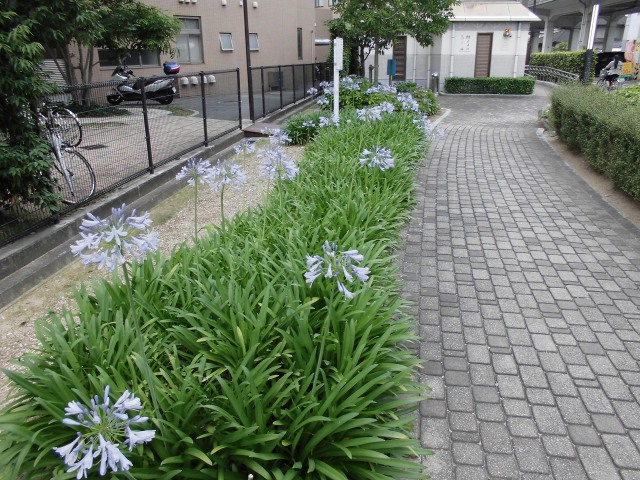 現在、徳島市の佐古駅東緑地でアガパンサスの青紫色の花が見頃となっています。