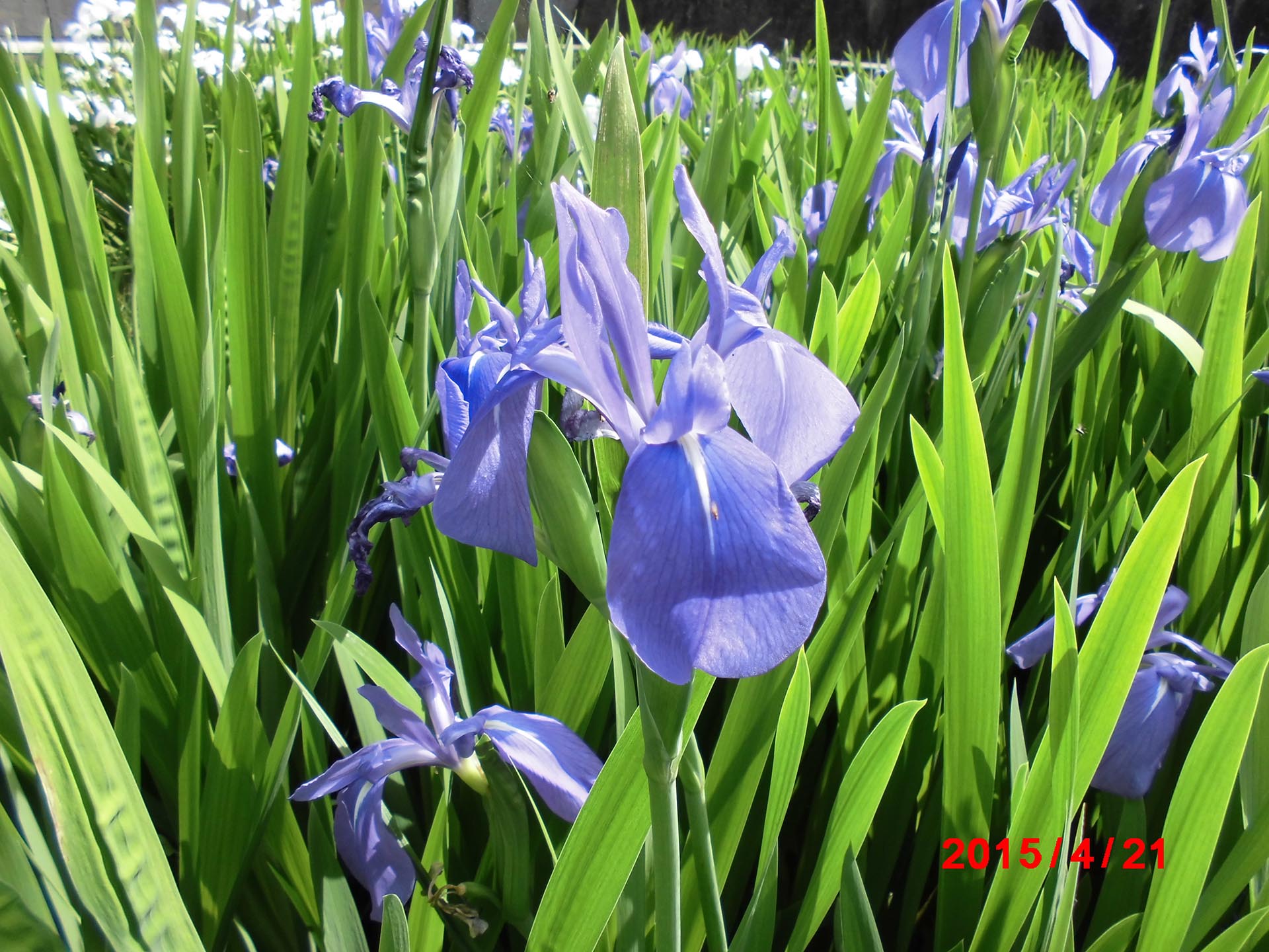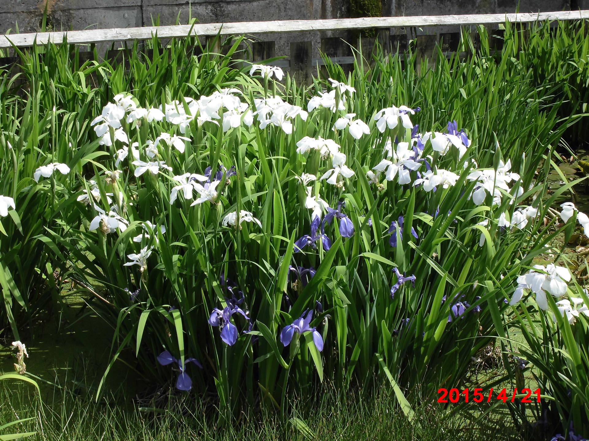 暑くも寒くもない、快い日和となりました。水辺にカキツバタの花が美しく咲いています。カキツバタは水辺を好み、湿地などに生育します。花はハナショウブによく似ていますが、カキツバタの方が一ヶ月ほど開花時期が早く、下向きの花びらの中央部に白い筋模様があります。